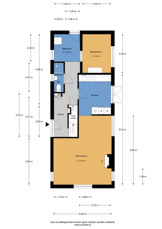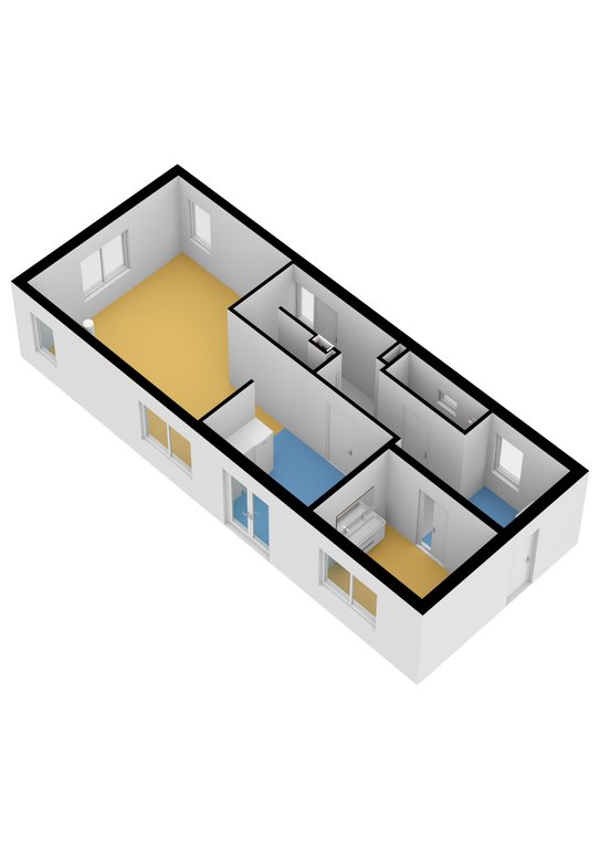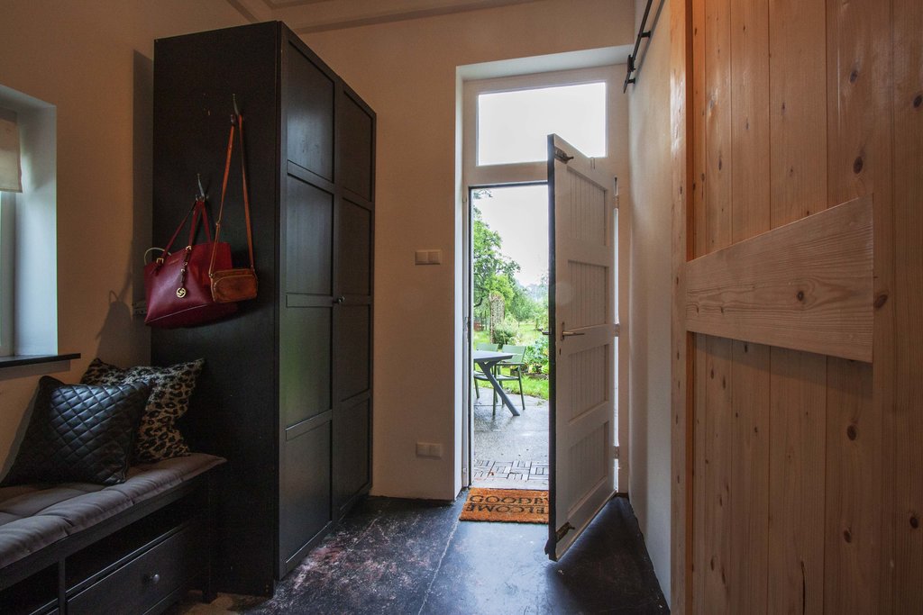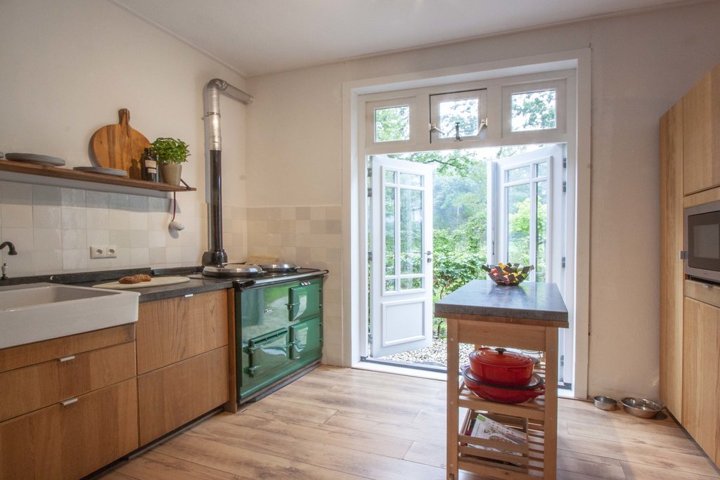 Entree, hal met toilet en douche, woonkamer met rookkanaal, half open keuken met inbouwapparatuur en openslaande deuren, slaapkamer met wastafel, in kast in de hal ruimte voor wasmachine en droger.