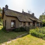 Een vrijstaande, rietgedekte garage naast de woning heeft een werkbank en een smeerput.