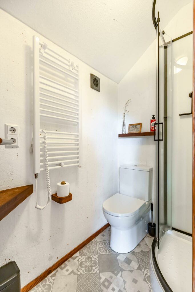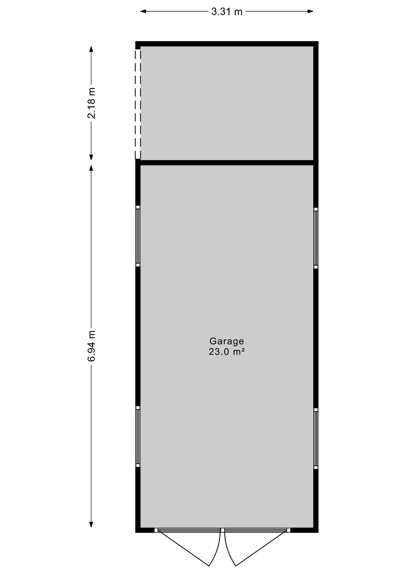 Een vrijstaande houten garage met aan de achterzijde twee toiletten voor camping gebruik.