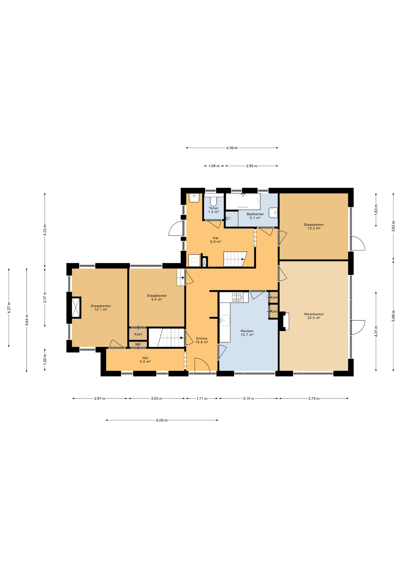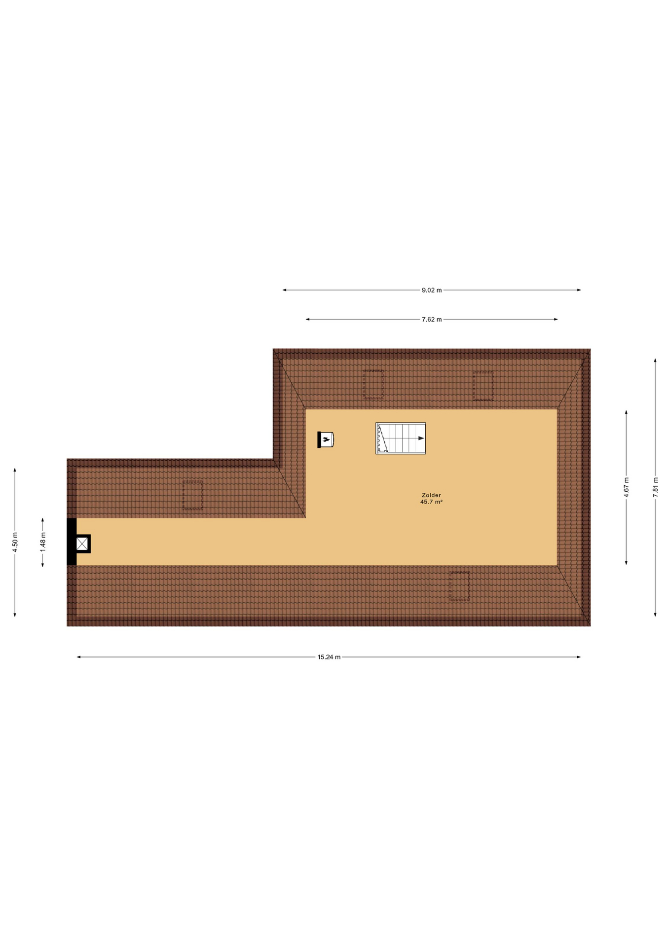 Via de entree, loopt u langs twee slaapkamers, de kelder, de meterkast, de woonkeuken met inbouwapparatuur naar de woonkamer met vrij uitzicht over de landerijen. Aan zijkant daarvan bevindt zich nog een slaapkamer die makkelijk bij de woonkamer te betrekken is. Daarnaast is er de badkamer met bad, een douche en een wastafel, de bijkeuken met toilet en de vaste trap naar de huidige zolderberging (Hier is de ruimte om meerdere slaapkamers te realiseren).