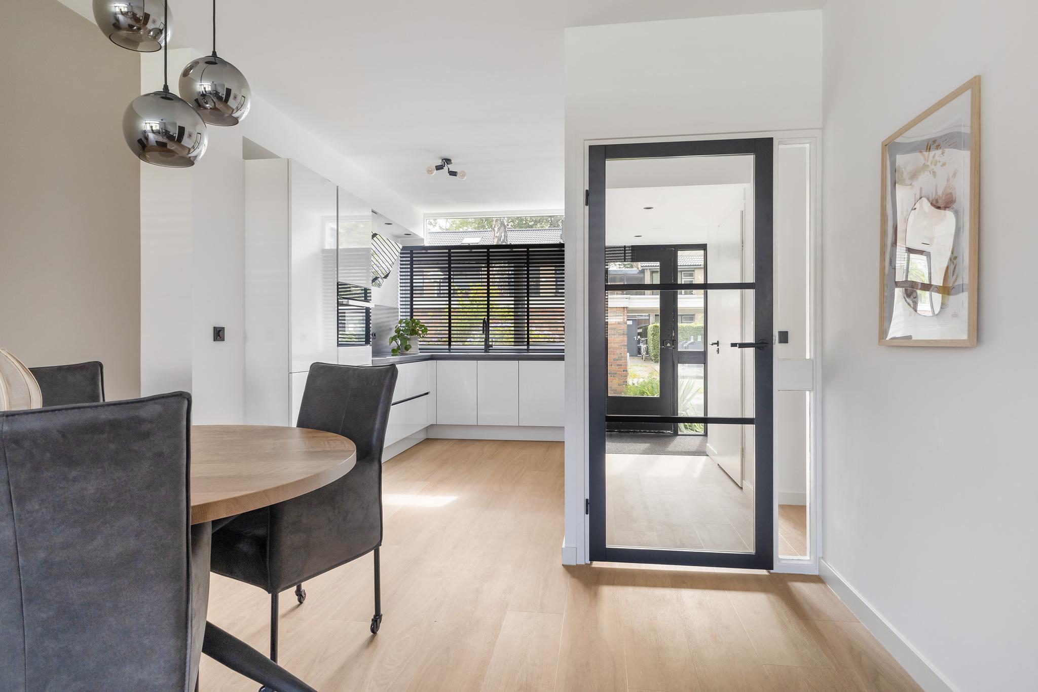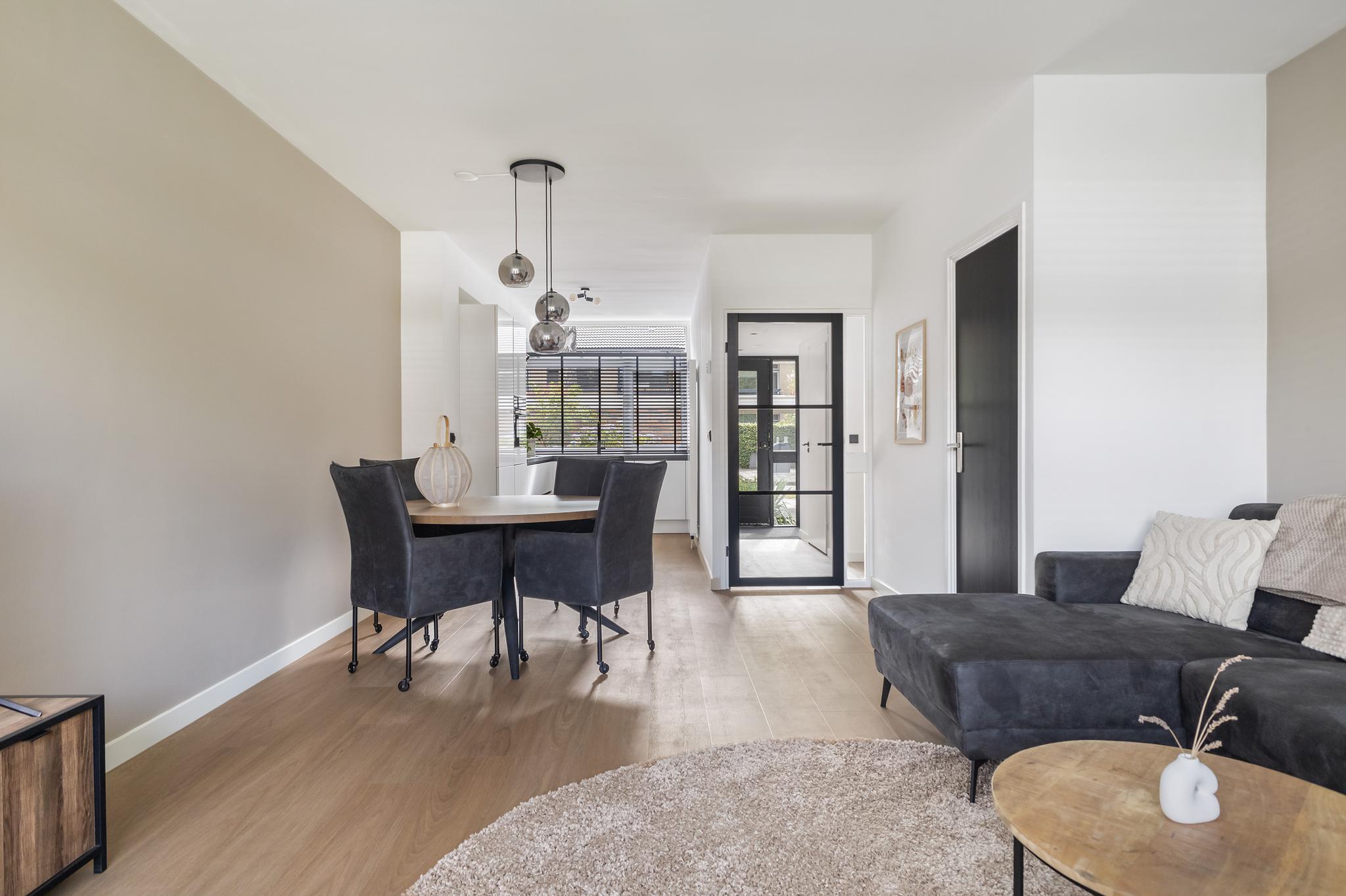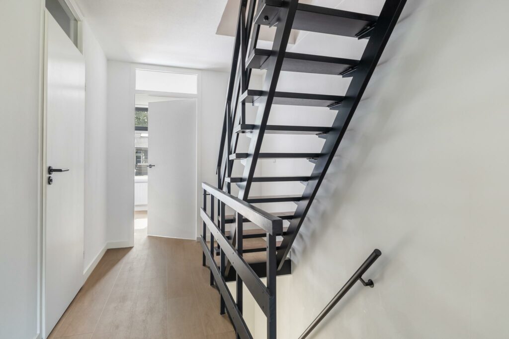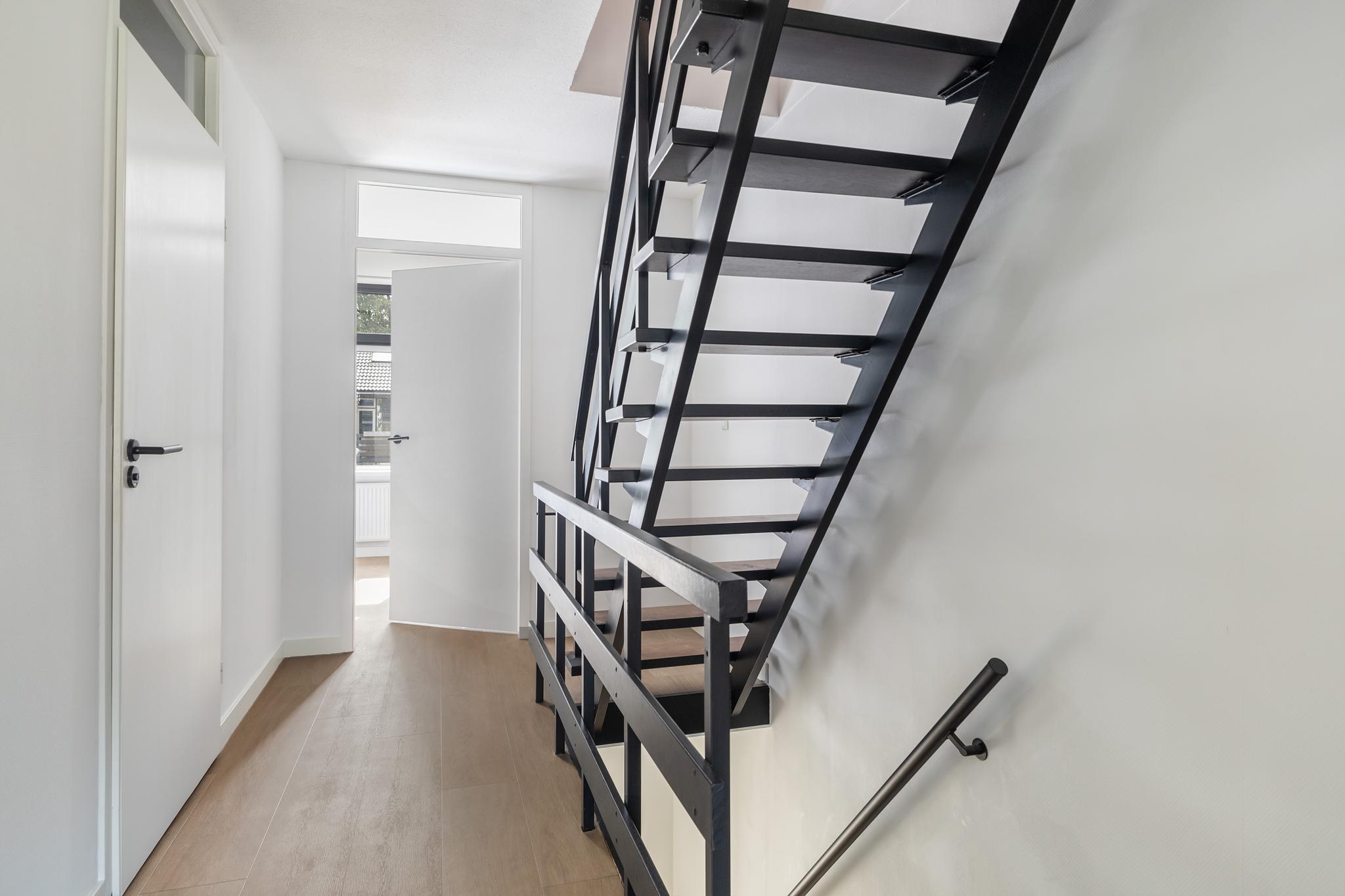 Entree, meterkast met waterontharder, modern toilet met fonteintje. De woonkamer is gezellig, is voorzien van een mooie PVC vloer en is tuingericht. De tuin heeft een lekker terras en er is een achterom. De keuken uit 2022 is ruim en heeft veel kastruimte. Er is een koelkast en een vriezer, een vaatwasmachine en een inductie vierpitskookplaat met afzuigkap. Via de gang gaan we naar boven, de trap is prachtig gerenoveerd.