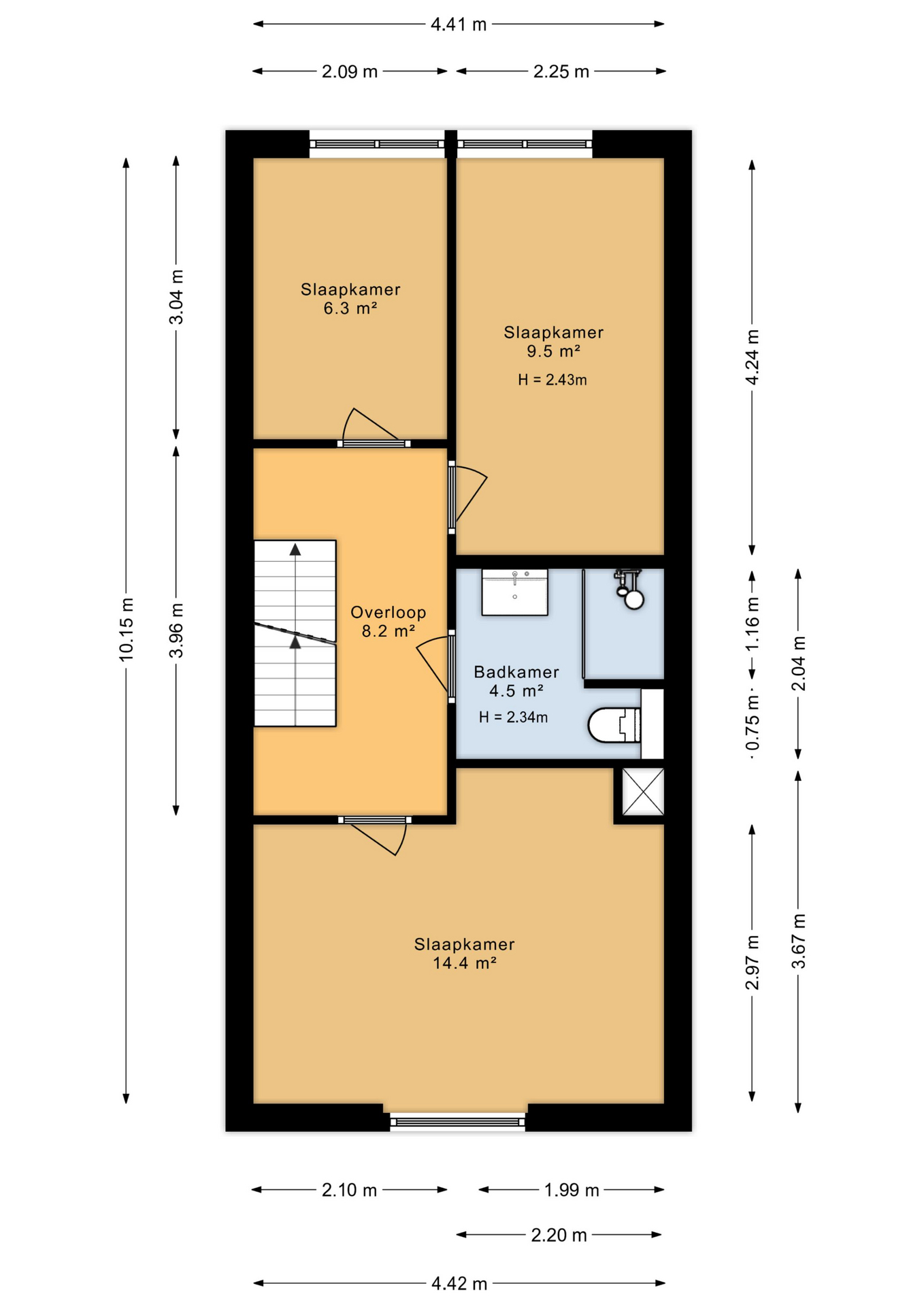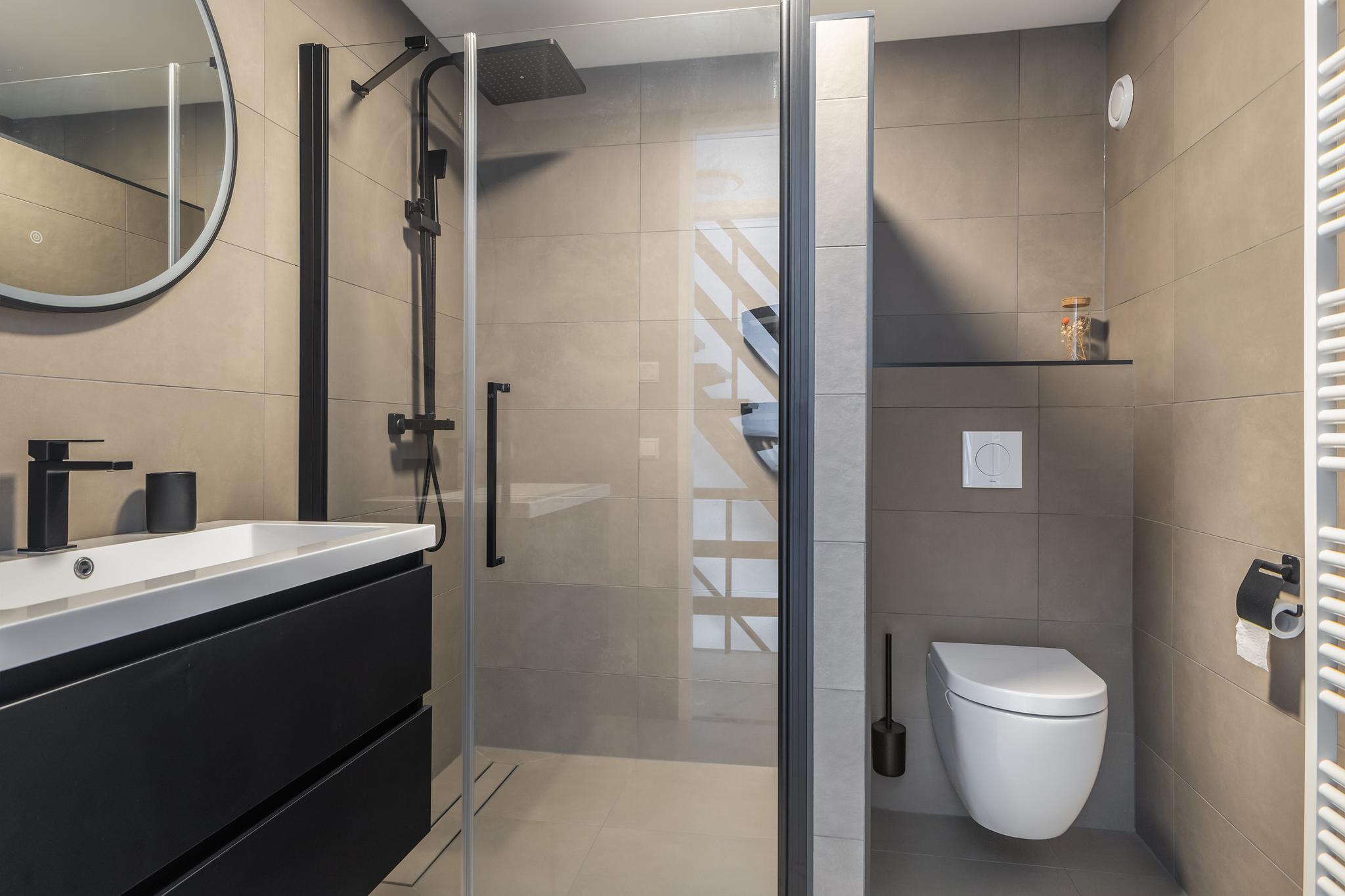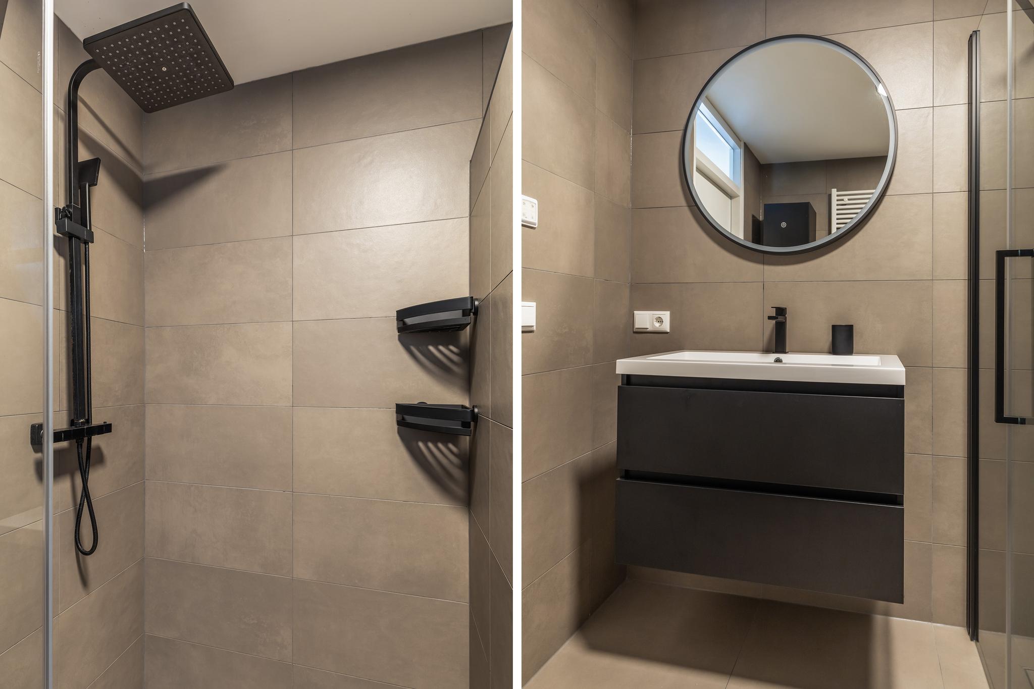 Een overloop met drie hele goede slaapkamers. De ouderslaapkamer is aan de voorzijde gelegen en er zijn twee slaapkamers aan de achterzijde. Tussen de slaapkamers ligt de onlangs geplaatste, zeer complete badkamer. Er is een douche met regendouche, een wastafel in meubel, een tweede toilet, een designradiator en voor al je badkamerspulletjes een handige hoge kast.
