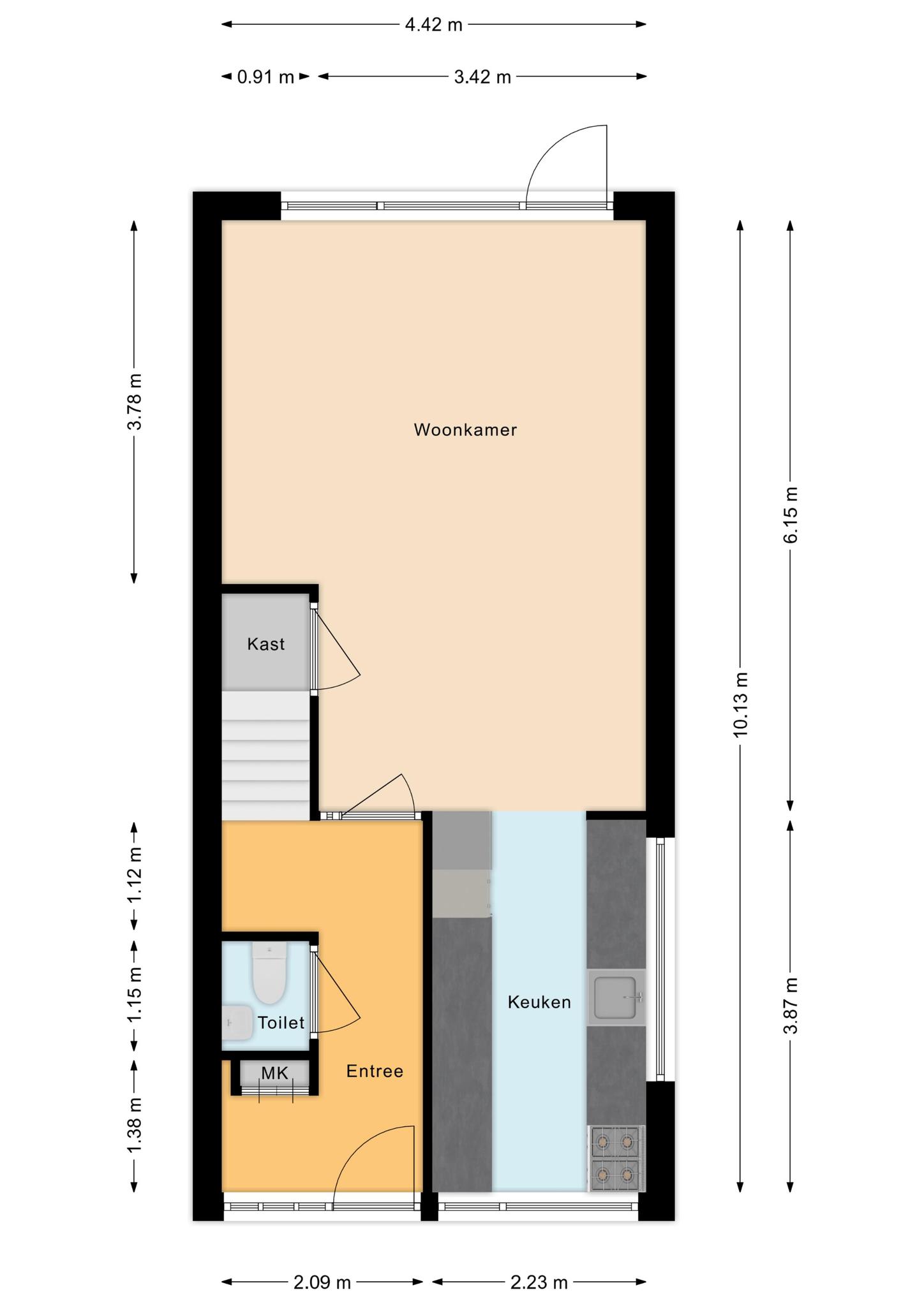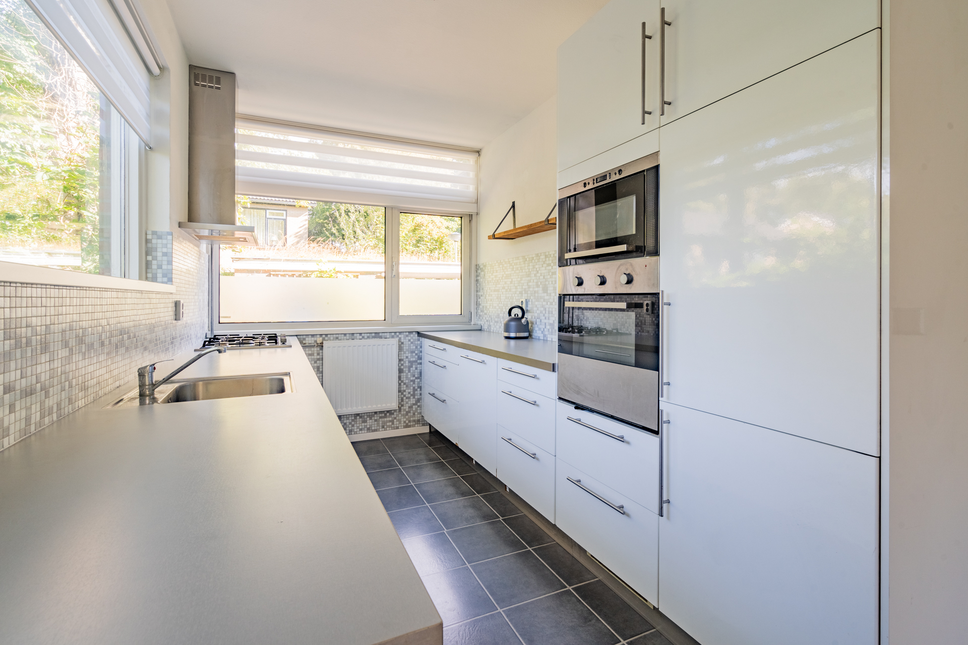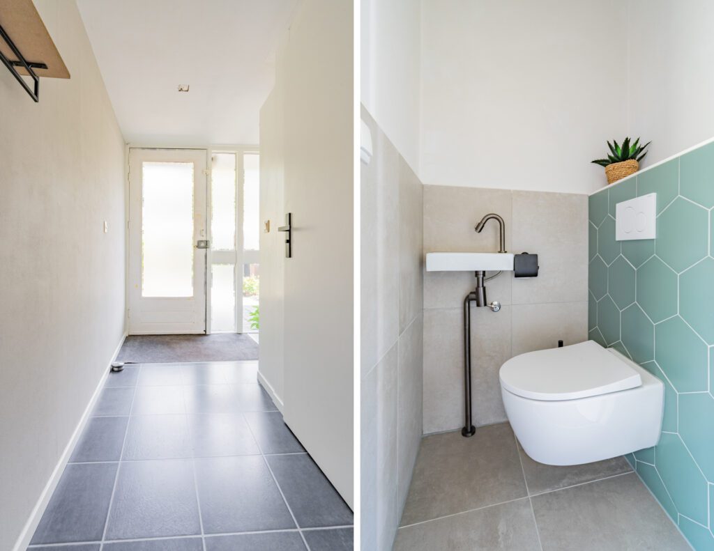 Voordat je bij de voordeur komt loop je door de voortuin, langs de handige stenen schuur. De entree van de woning is licht, hier zijn de meterkast en het toilet. De tuingerichte woonkamer biedt toegang tot de moderne witte keuken. Ook hier valt op dat het licht is door het extra zijraam in de keuken. Via de gang en de trap kom je op de eerste etage.