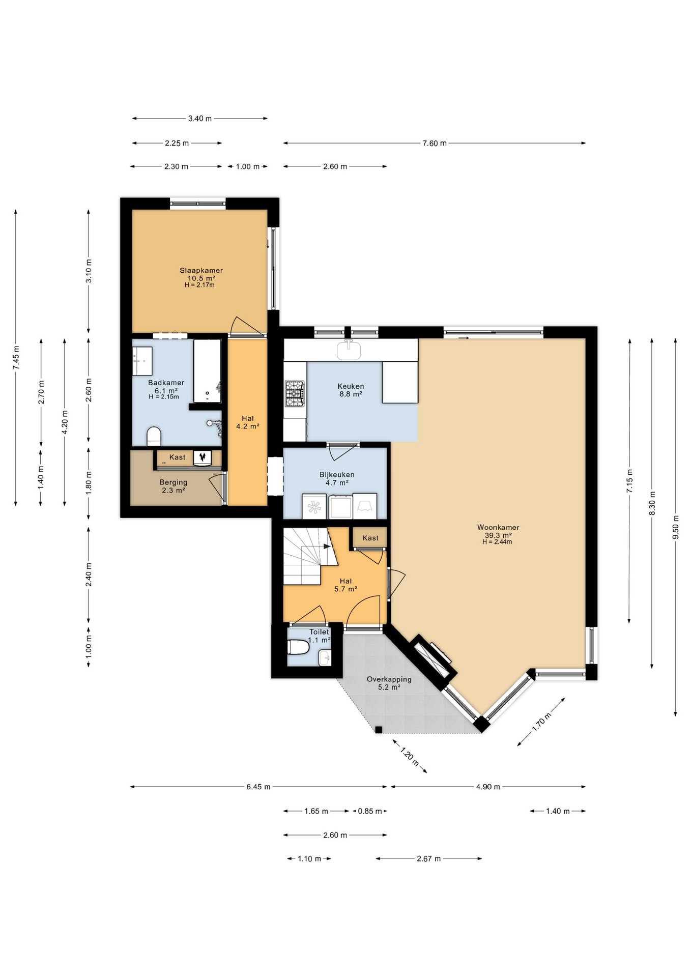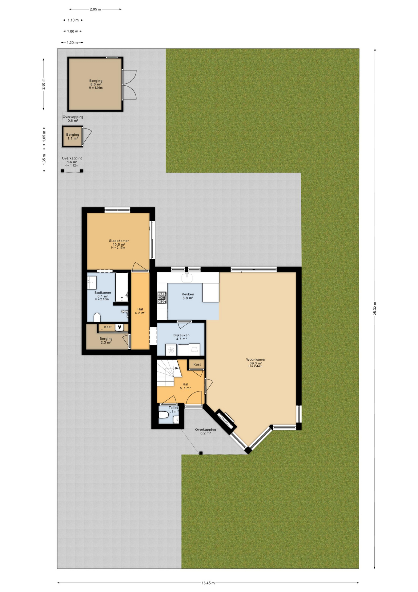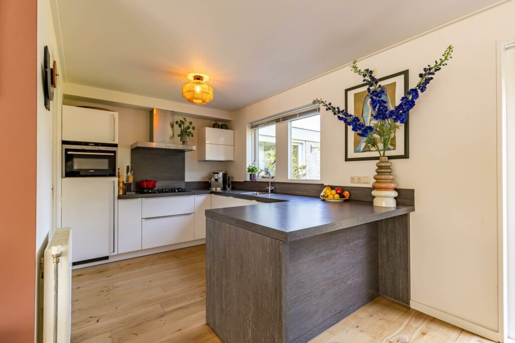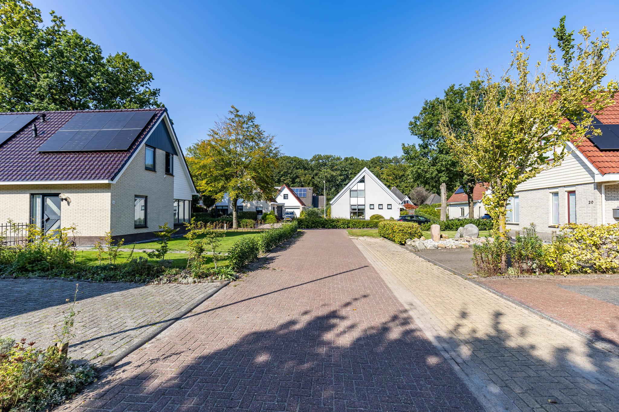 Via de ruime oprit, welke geschikt is voor meerdere auto’s, komt u bij de voordeur aan. In de hal bevinden zich het toilet en de meterkast. De woonkamer is ruim opgezet met een tv hoek en een openhaard. Daarnaast vindt u er de eethoek met schuifpui naar het terras en de half open keuken met inbouwapparatuur. De doorgang naar de inloopbergruimte beschikt over een wasmachine, een droger opstelling en daarnaast een ruime voorraadkamer. De omgebouwde garage wordt momenteel gebruikt als kantoor, maar is ook zeer geschikt als slaapkamer met badkamer en suite voor levensloop bestendig wonen.