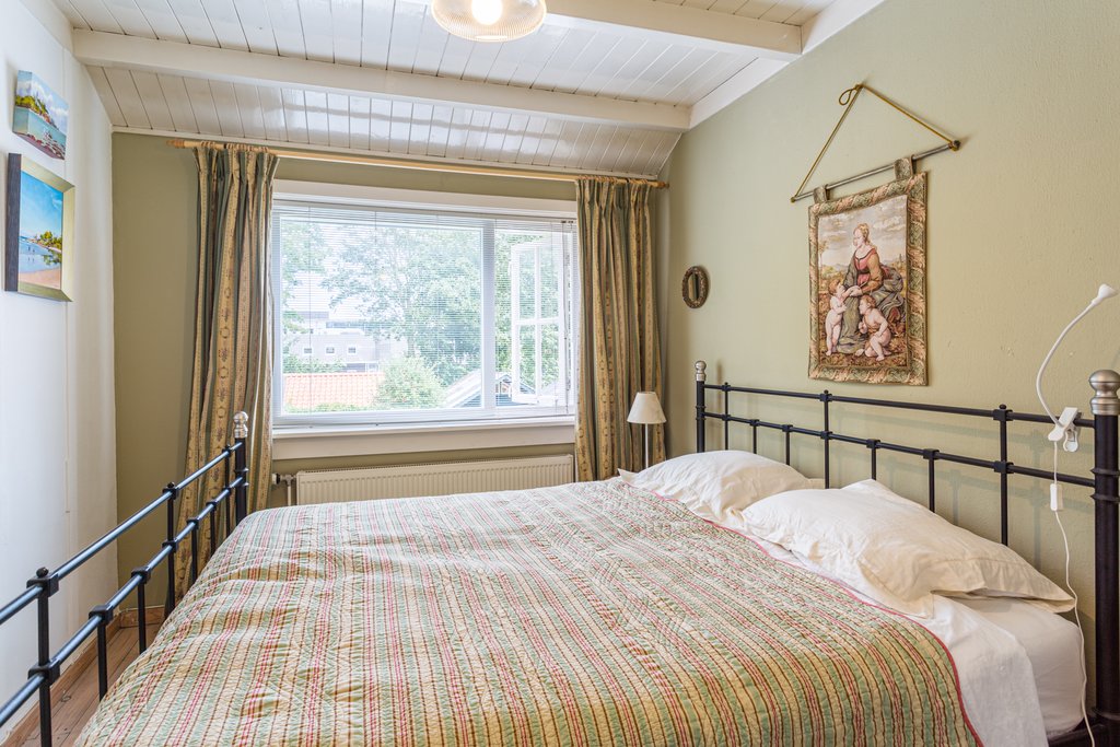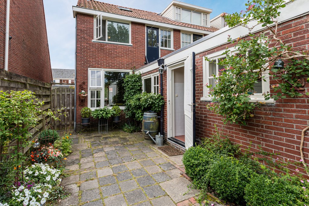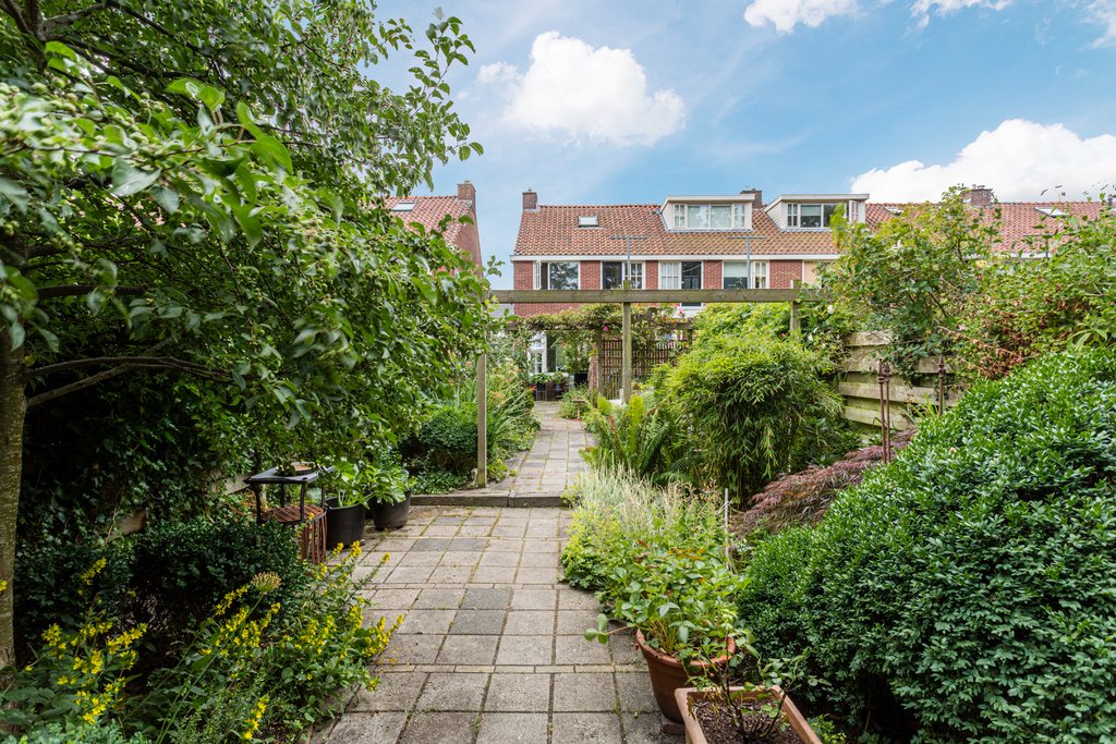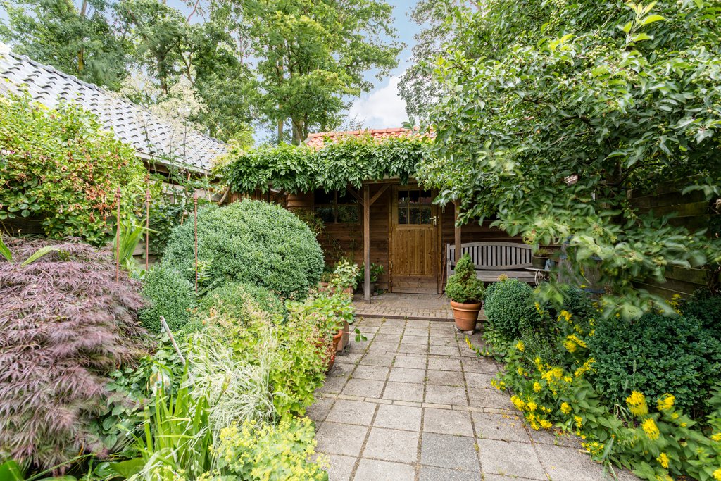 Leuke speelse groene tuin met houtenschuur achter op de tuin met toegang via steeg waar u zo het centrum inloopt.