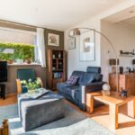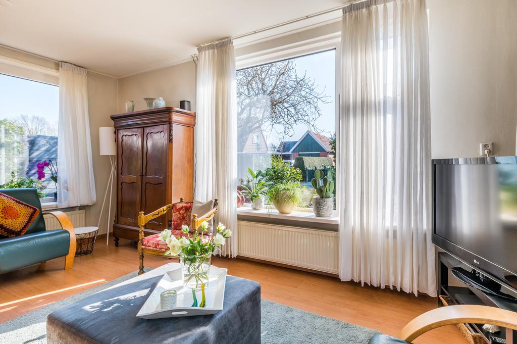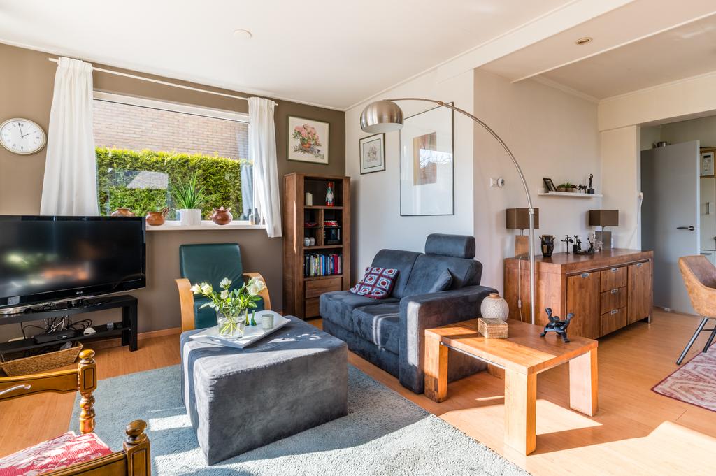 De woonkamer heeft een heerlijke lichtinval dankzij de vele raampartijen.