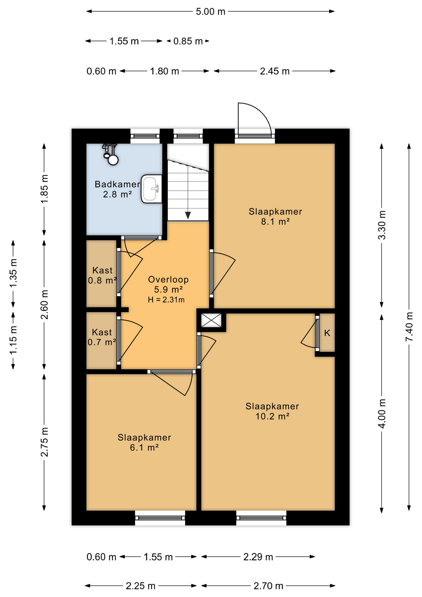 Op de verdieping komt u op de overloop met handige kastenwand. Hier is er toegang tot de drie slaapkamers, waarbij de slaapkamer aan de achterzijde toeging biedt tot het dakterras. De badkamer is eenvoudig en heeft een wastafel en een douche.