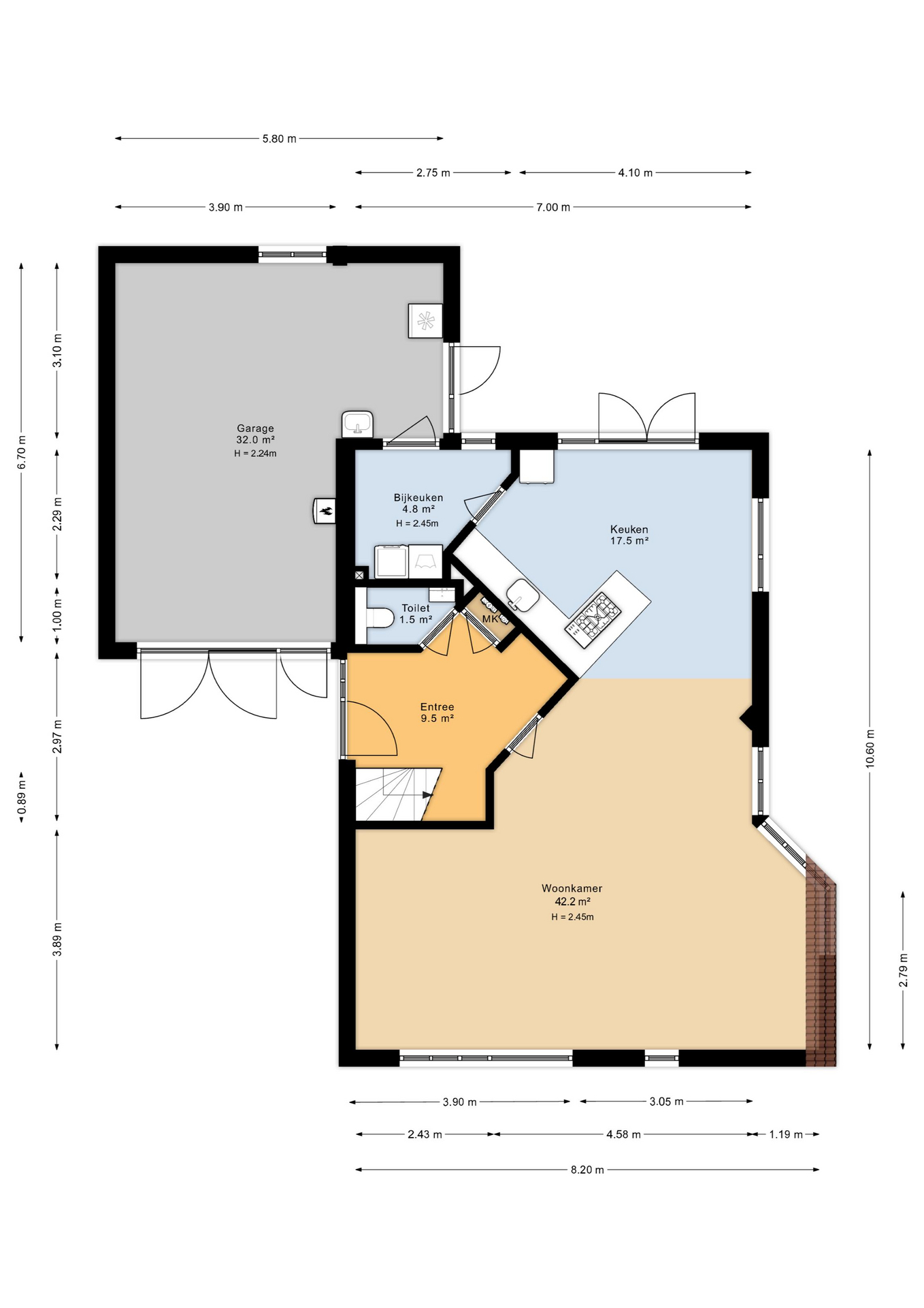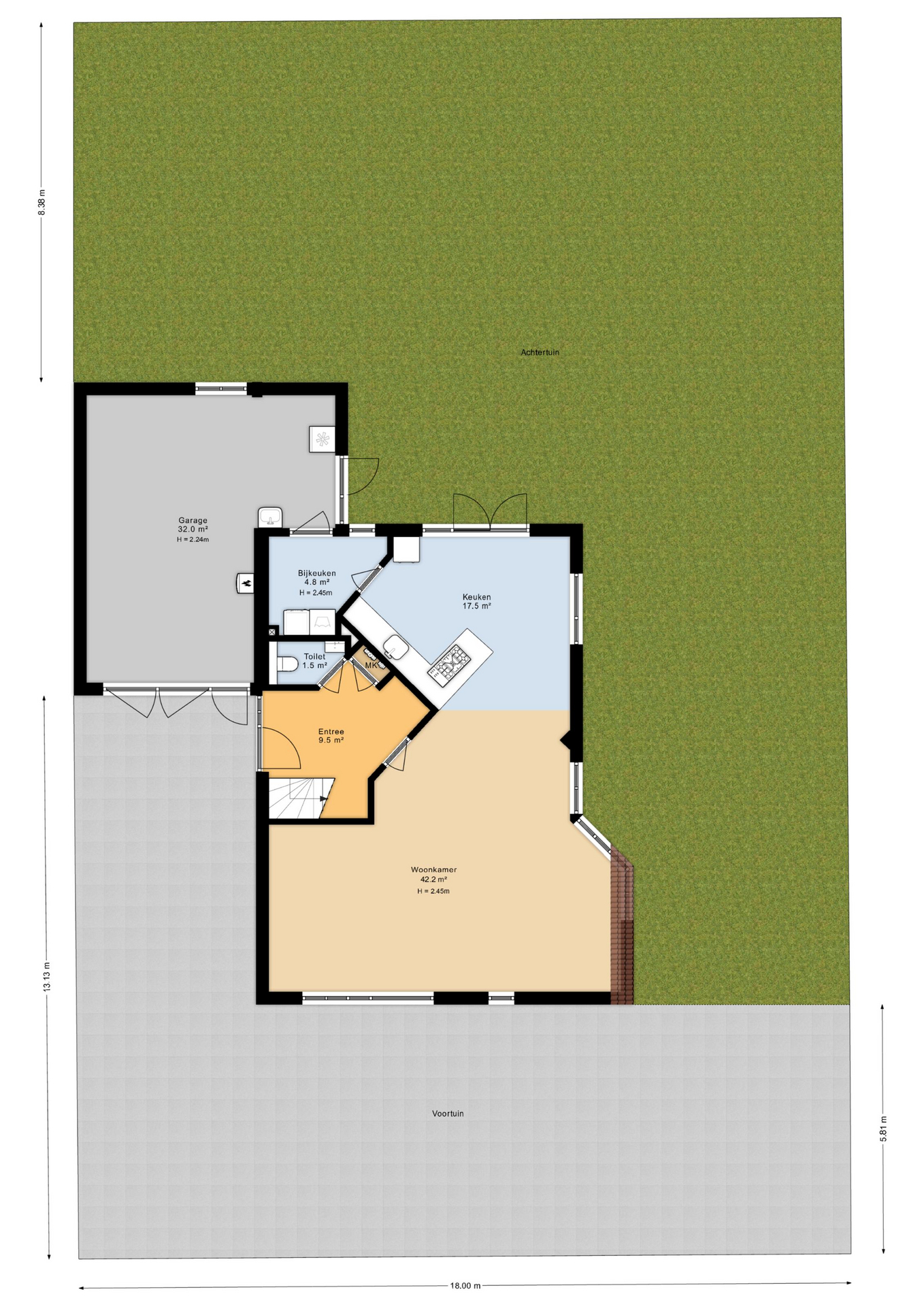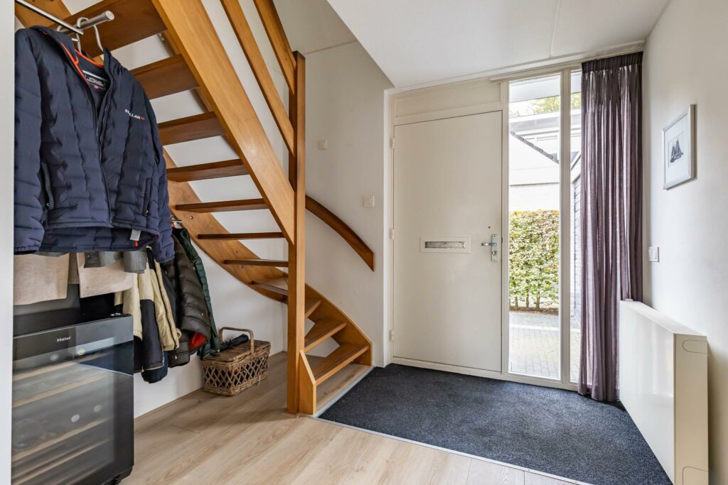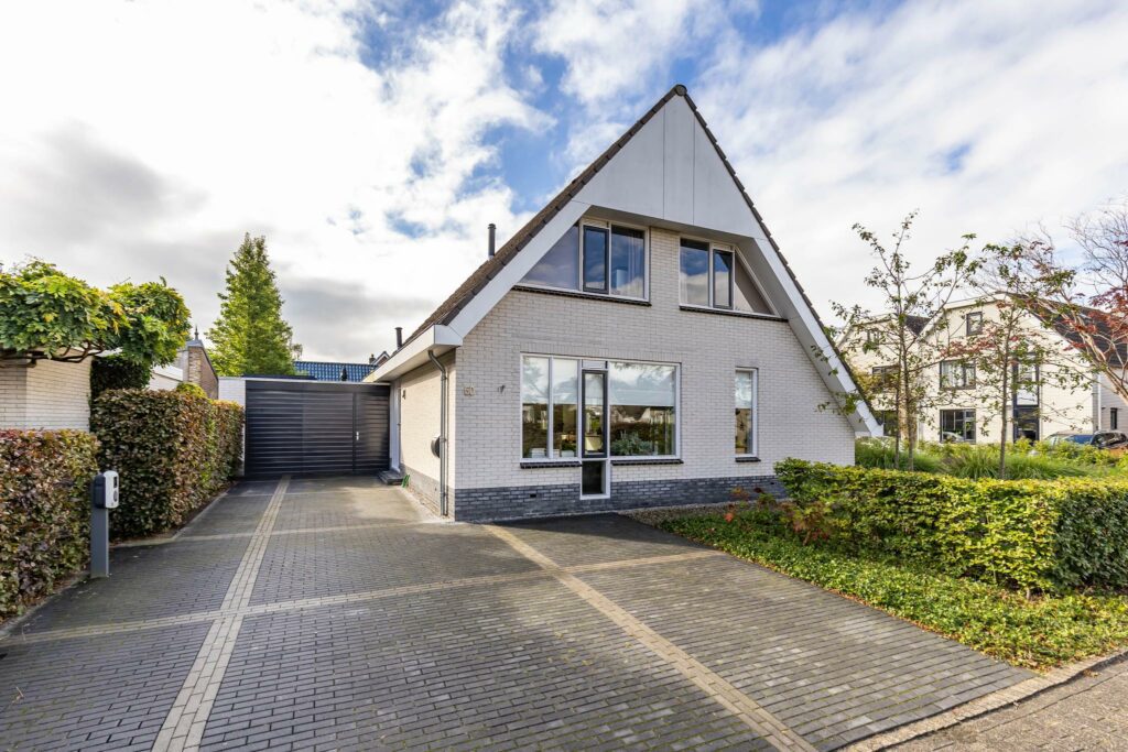Via de ruime oprit welke geschikt is voor meerdere auto’s, komt u bij de voordeur aan. In de ruime hal met toilet met fontein vindt u de meterkast en onder de trap is er de ruimte om jassen op te hangen. Zodra u de deur naar woonkamer open doet, voelt u de ruimte van de woning. De invulling van de woning is helemaal naar eigen smaak in te delen. De royale en gezellige zithoek heeft ruimte voor meerdere grote banken. De huidige eethoek is aan de zijkant geplaatst om zo optimaal de ruimte te kunnen benutten. Daarnaast is er een half open keuken met inbouwapparatuur en een zitgedeelte met een fijn uitzicht op de tuin. Tevens is er een bijkeuken en een royale L-vormige garage aanwezig.