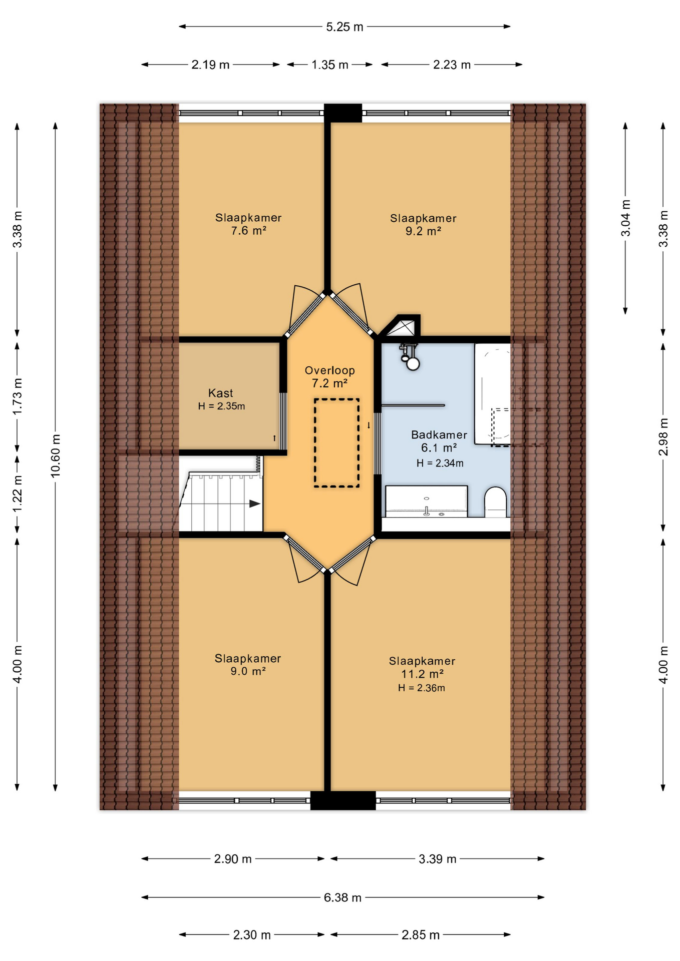 Op de eerste verdieping zijn vier ruime gelijke slaapkamers, een badkamer met een douche, ligbad, een wastafel en een toilet. Op de overloop is een inloopkast aanwezig om spullen op te bergen. Via de vlizotrap komt u op de zolderberging waar over de gehele verdieping ruimte is voor uw seizoens spullen.