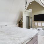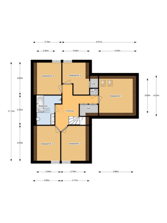 via de trap komt u op overloop met toegang tot 5 slaapkamers, badkamer met bubbelbad, douche, wastafel en toilet.