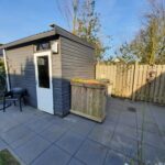 entree, hal met toilet, bergkast, woonkamer met half open keuken met inbouwapparatuur, bijkeuken, nette tuin op het Noordoosten, houtenberging achter in de tuin met achterom.