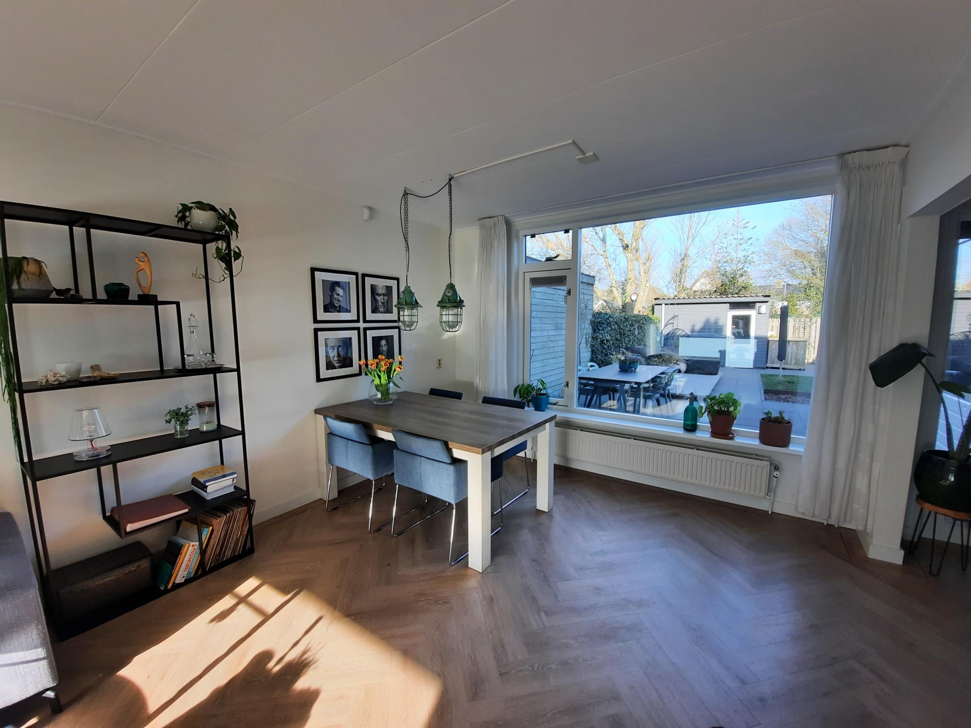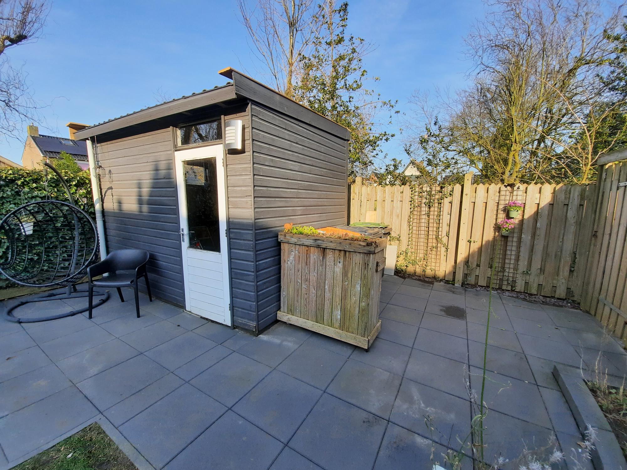 entree, hal met toilet, bergkast, woonkamer met half open keuken met inbouwapparatuur, bijkeuken, nette tuin op het Noordoosten, houtenberging achter in de tuin met achterom.