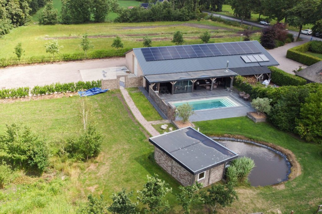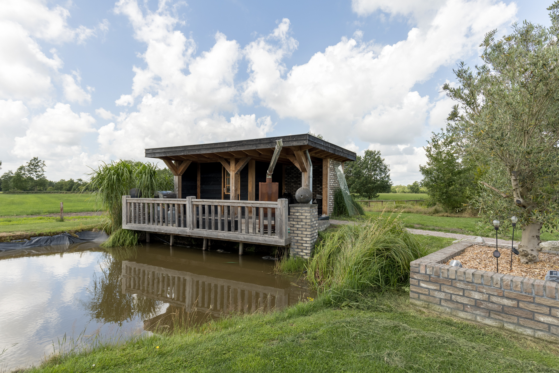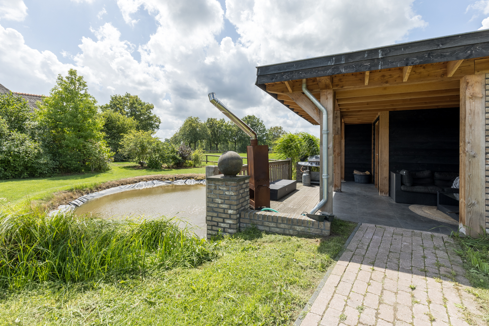 Via de achterdeur loopt u onder een pergola met volgroeide blauwe regen richting het zwembad. Het zwembad ligt heerlijk in de zon met naast het zwembad een poolhouse. Dit poolhouse is volledig af te sluiten en is voorzien van een houtkachel en een geheel nieuwe sauna. Vanuit het zwembad kijkt u uit over de vijver met naast de vijver een heerlijke veranda voor een gezellige barbecue. Hier is ook nog een ruimte welke als gastenverblijf kan fungeren. De volledig geïsoleerde loods/werkplaats ligt verscholen achter het poolhouse. Bij deze loods ligt een grote gedraineerde parkeerplaats die ook voor een paardenbak plaats kan maken.