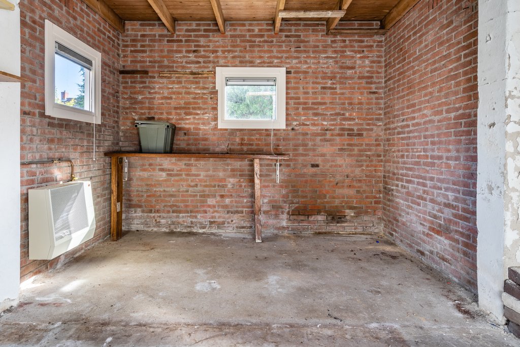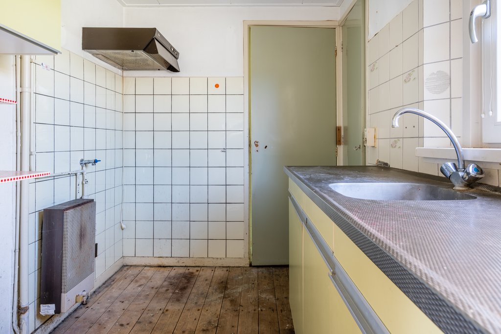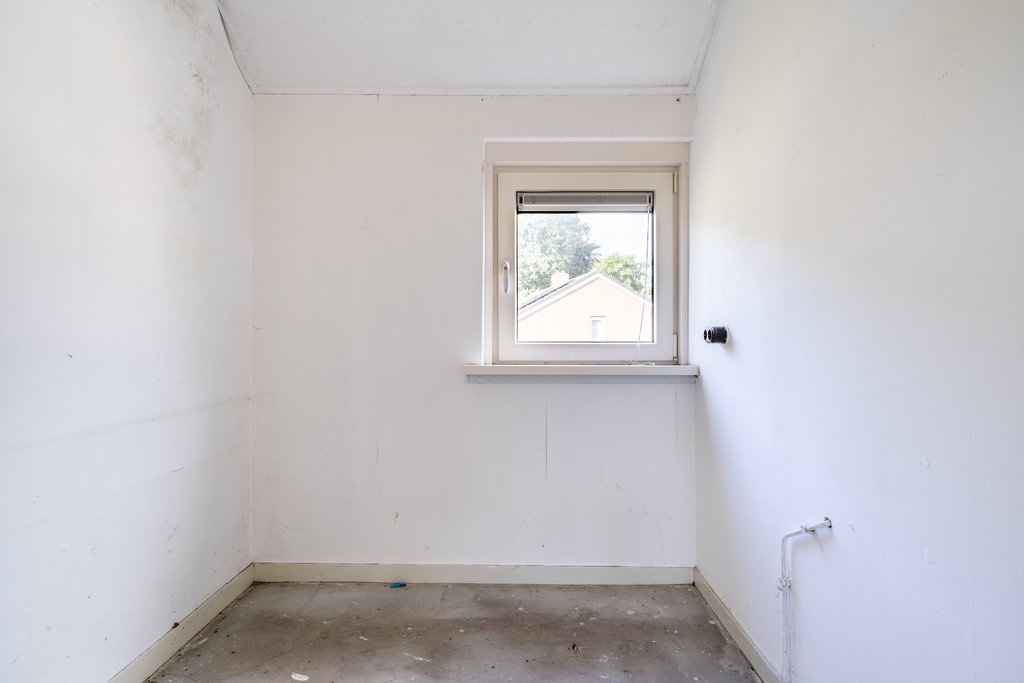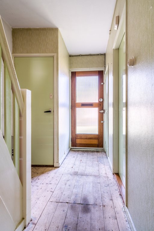 Via de voordeur in de hal zit een toilet, keldertje, woonkamer met openslaande deuren naar achtertuin, keuken, bijkeuken, achtertuin die naar smaak kan worden ingericht.
