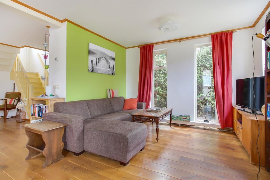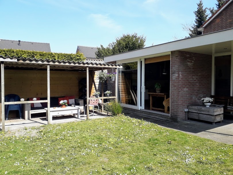 Entree, hal met ruime toilet, L-vormige woonkamer, woonkeuken met schuifpui, in de tuin een veranda, vrijstaande garage volledig geïsoleerd en een tuin met verbinding naar het park toe.