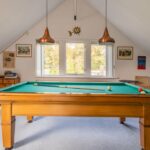 vaste trap naar ruime zitruimte, mogelijkheid voor toilet en douche boven, ruime kamer waarin nu biljarttafel.