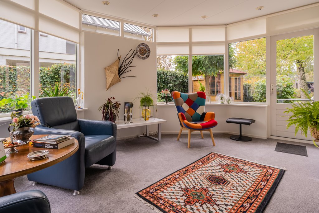 entree, hal met toilet, ruime woonkamer, serre, woonkeuken met inbouwapparatuur, dubbele hal, slaapkamer, badkamer met douche, wastafel en toilet, bijkeuken, houten berging en tuin op het zuiden.