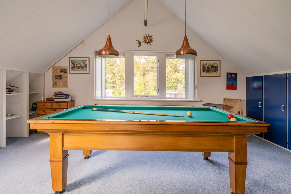 vaste trap naar ruime zitruimte, mogelijkheid voor toilet en douche boven, ruime kamer waarin nu biljarttafel.