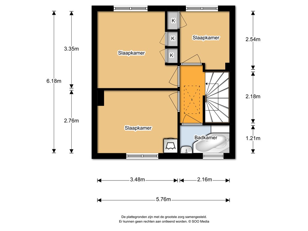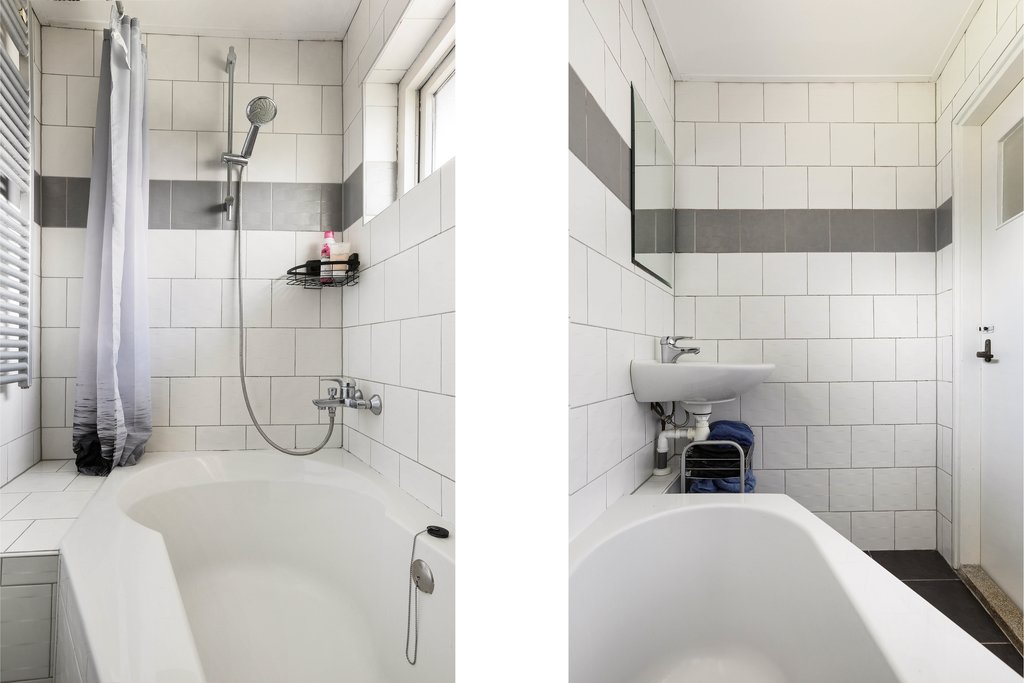 overloop, 3 slaapkamers, badkamer met bad en wastafel.