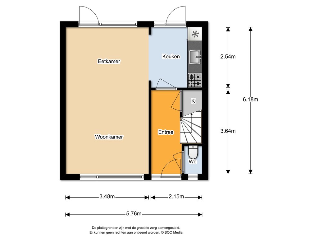 entree, hal met toilet, kelder, woonkamer, open keuken met inbouwapparatuur, berging, houtenberging, tuin met achterom.
