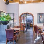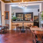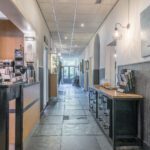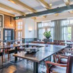 Bij de voorentree komt u via het tochtportaal in de lange gang die deuren en opening biedt naar elke ruimte in het restaurant. In de hal gelijk links bevindt zich de bar met verschillende zitplekken. Aan de andere kant van de hal zijn verschillende ruimtes die afzonderlijk van elkaar te gebruiken zijn of in zijn geheel. Daarnaast is er een grote vergaderruimte met openslaande deuren naar het terras. Aan het einde van de lange gang zijn er toiletten voor zowel de heren als de dames.
