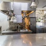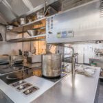Daarachter bevindt zich de keuken met opstelling en een afwashoek. De zij entree heeft een trap naar de eerste verdieping waar er ruimte is voor het personeel om zich te verkleden en er is een berging aanwezig. De begane grond heeft een bezetting van ongeveer 130 gasten wat uit te breiden is.