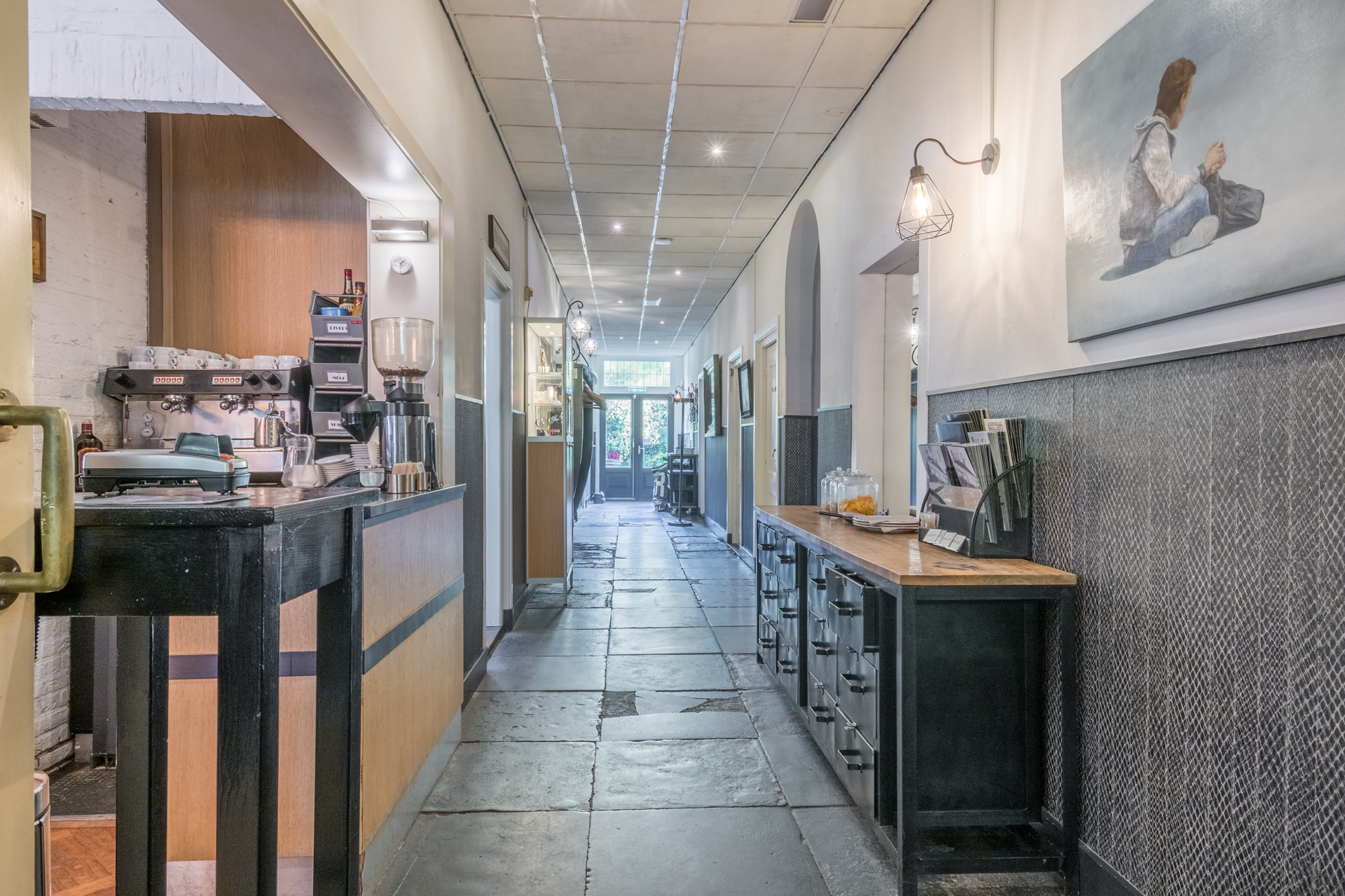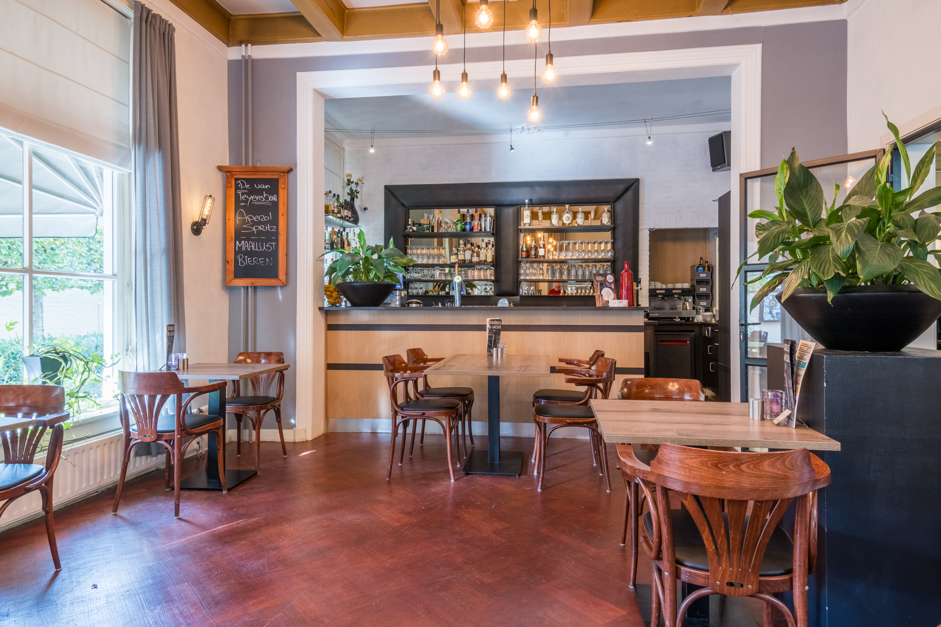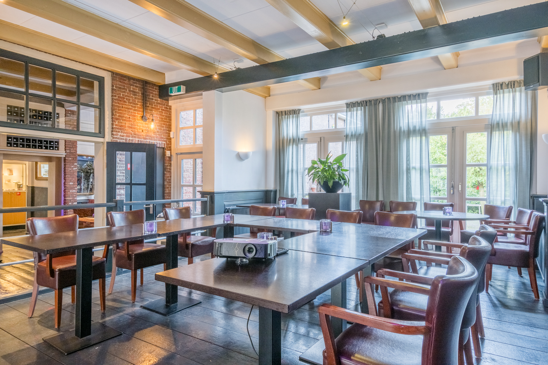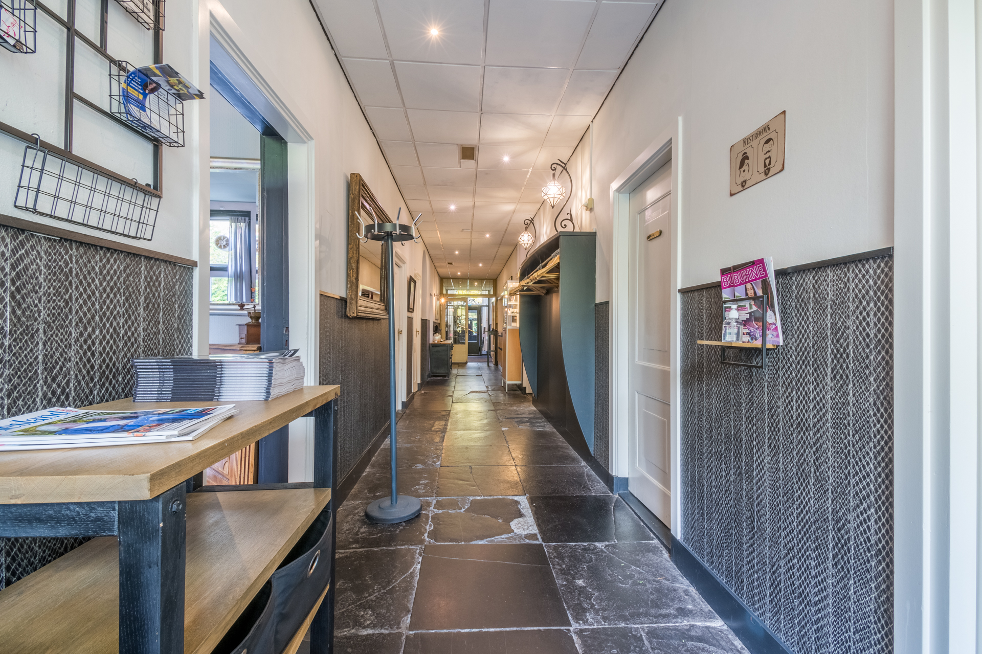 Bij de voorentree komt u via het tochtportaal in de lange gang die deuren en opening biedt naar elke ruimte in het restaurant. In de hal gelijk links bevindt zich de bar met verschillende zitplekken. Aan de andere kant van de hal zijn verschillende ruimtes die afzonderlijk van elkaar te gebruiken zijn of in zijn geheel. Daarnaast is er een grote vergaderruimte met openslaande deuren naar het terras. Aan het einde van de lange gang zijn er toiletten voor zowel de heren als de dames.
