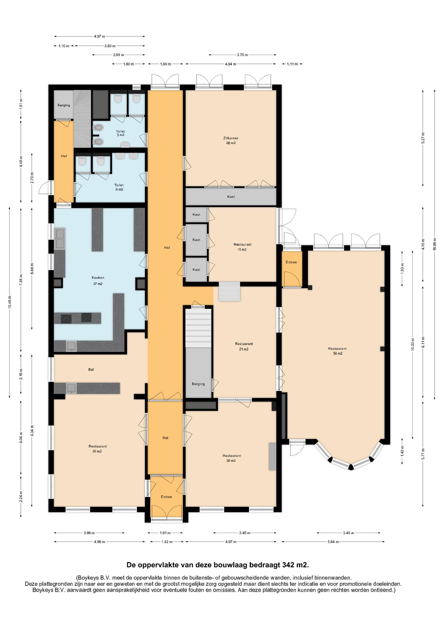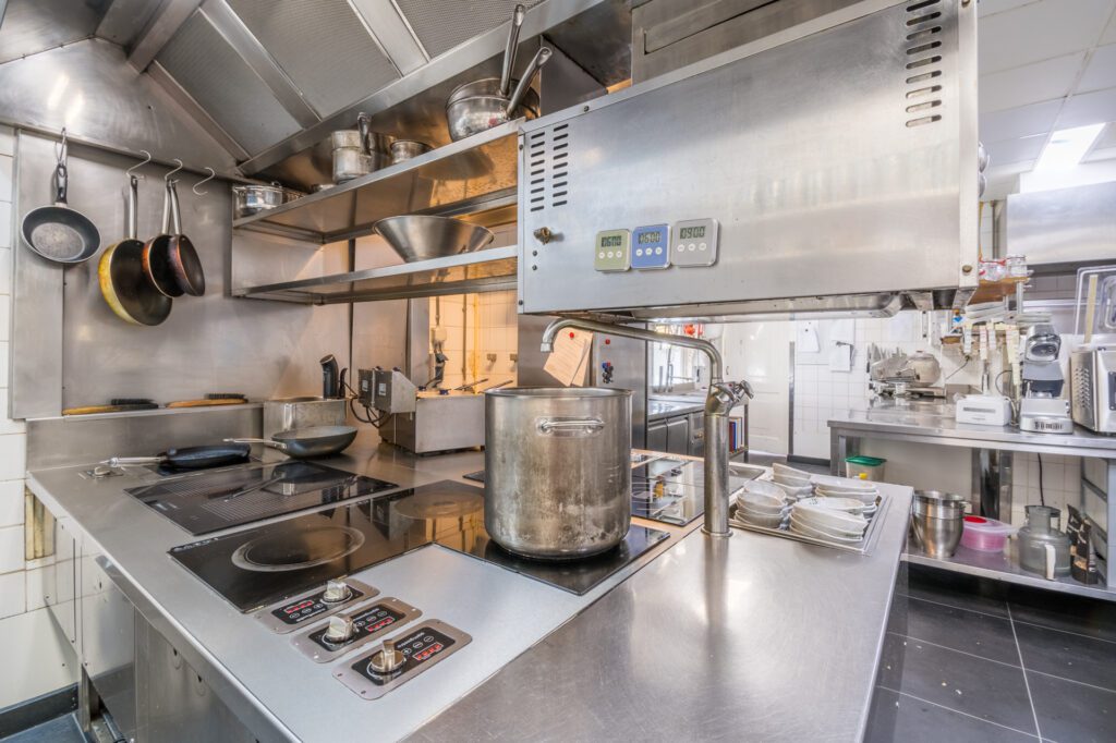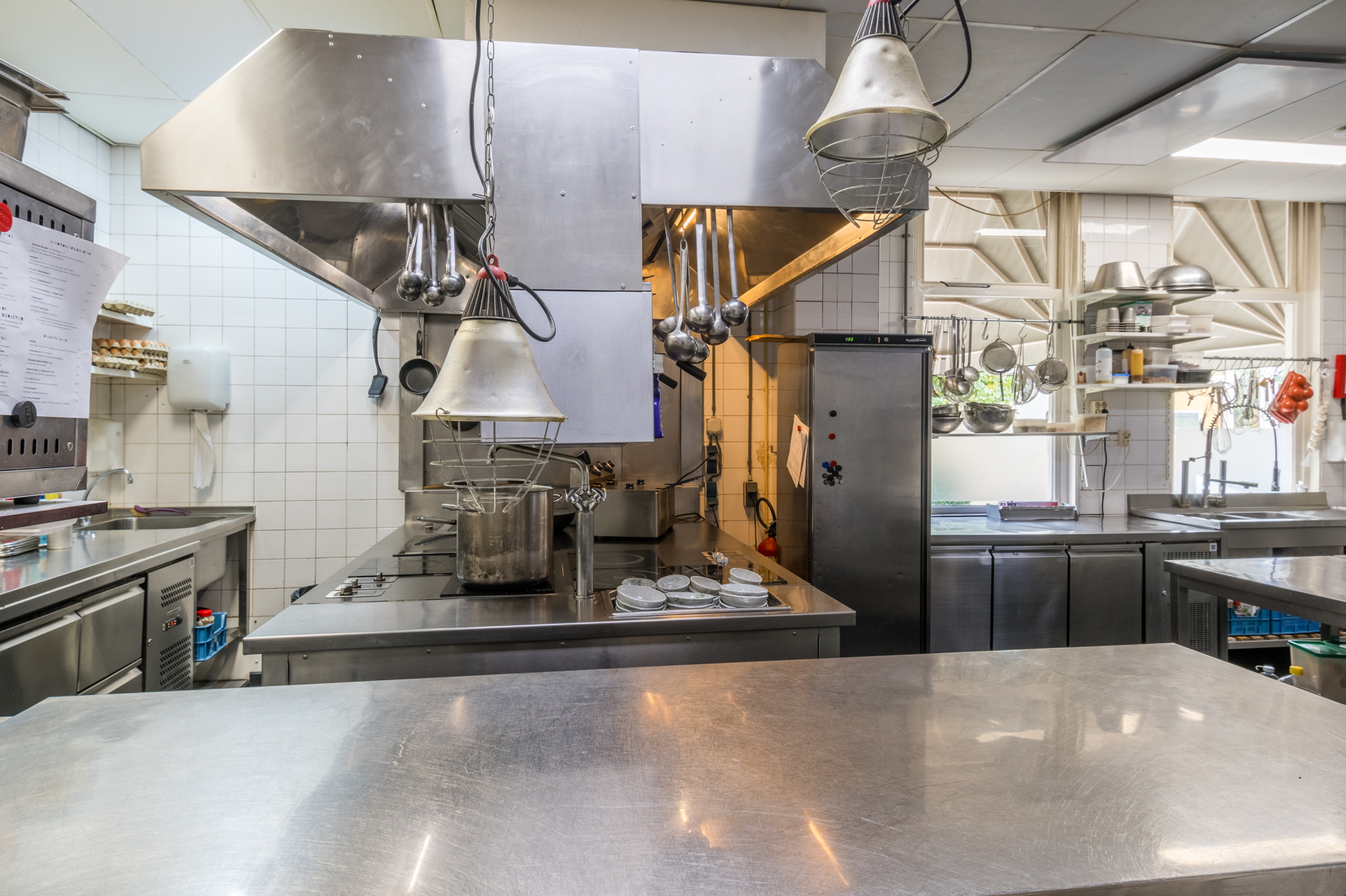 Daarachter bevindt zich de keuken met opstelling en een afwashoek. De zij entree heeft een trap naar de eerste verdieping waar er ruimte is voor het personeel om zich te verkleden en er is een berging aanwezig. De begane grond heeft een bezetting van ongeveer 130 gasten wat uit te breiden is.