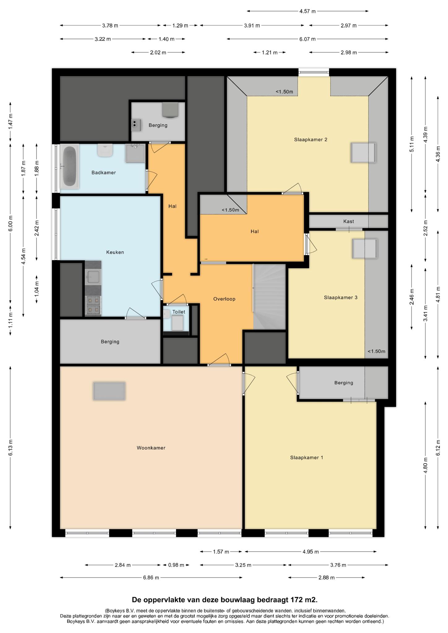 In de lange gang bij de voorentree is er een deur naar de trap die leidt naar het bovengelegen royale appartement. Het appartement heeft drie slaapkamers, een grote woonkamer, een keuken met inbouwapparatuur, een badkamer met douche, een bad en een wastafel, een separate toilet en berging en een wasruimte.