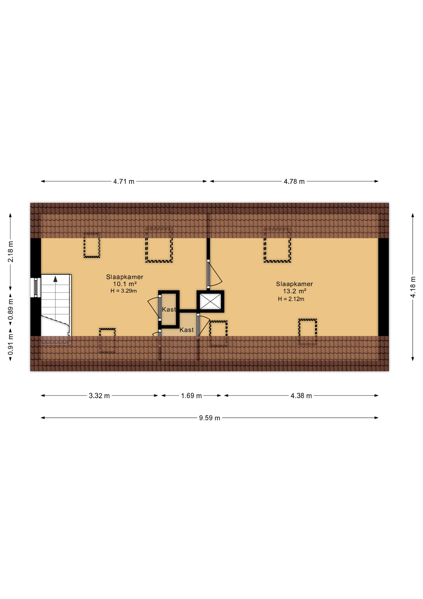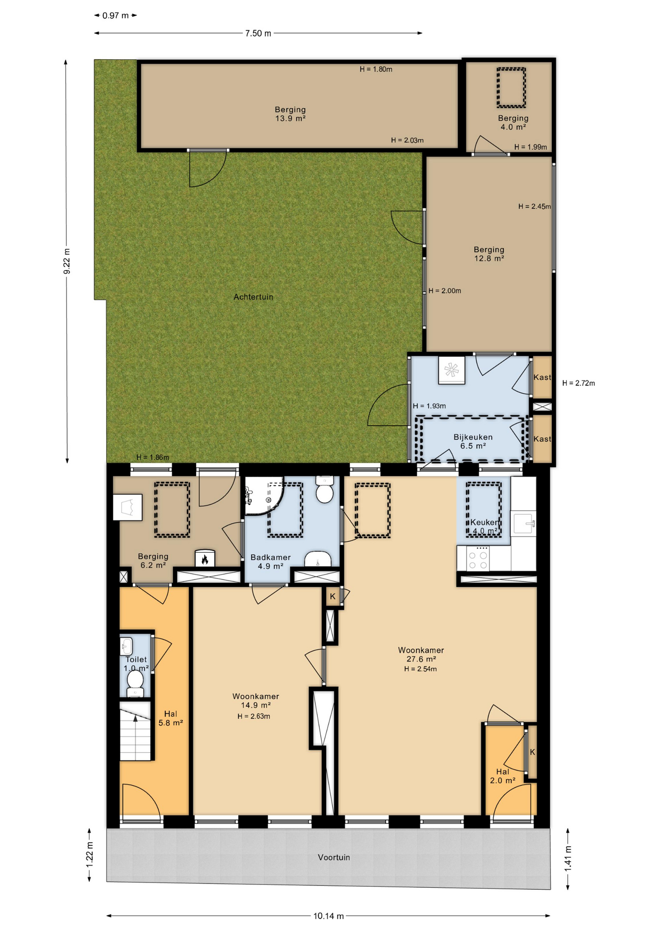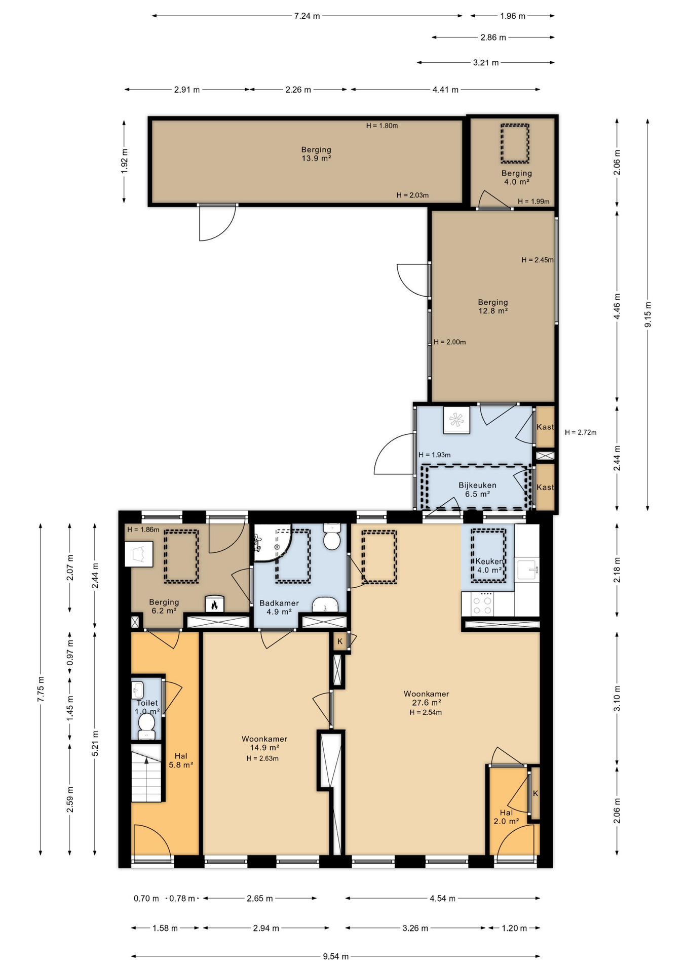 U komt binnen via de rechter voordeur en loopt de gang door. Via deze gang komt u in de gezellige eerste woonkamer. De woonkamer is licht en behaaglijk. Via deze woonkamer komt u in de keuken. De keuken is voorzien van een elektrische kookplaat en een vaatwasser. In de keuken is de toegang naar de bijkeuken en de schuur. Via de woonkamer komt u ook in de tweede woonkamer. Beide kamers zijn voorzien van een betonvloer met vloerverwarming als bijverwarming. Naast deze tweede woonkamer is de tweede gang, de entree van de voormalige tweede woning. Hier treft u het aparte toilet aan en de badkamer. De badkamer is voorzien van een douche, een wastafel en een tweede toilet. In deze gang is ook de trap naar de gehele eerste etage. Hier zijn twee slaapkamers en vaste kasten.