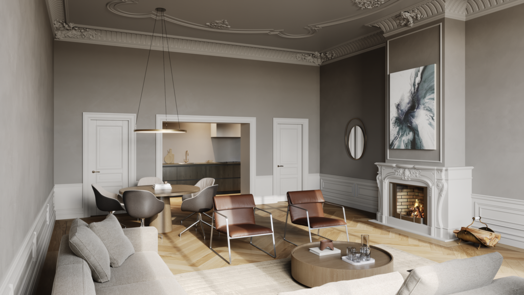 ornamentenplafond met een hoogte van bijna vier meter. Naast de woonkamer is er de