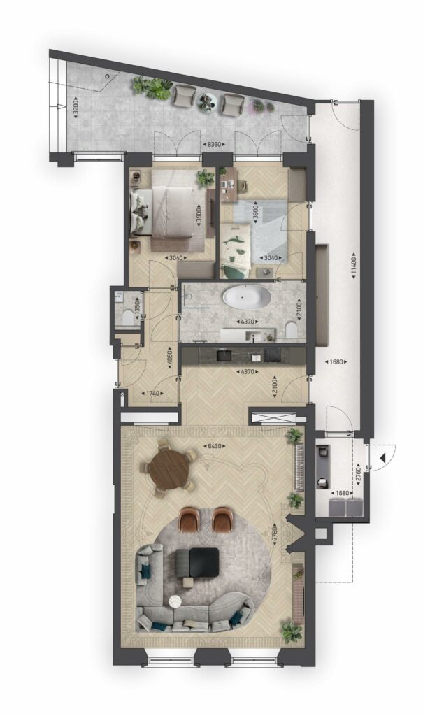 Een royale badkamer en apart toilet zijn gesitueerd centraal in het appartement. Er is een