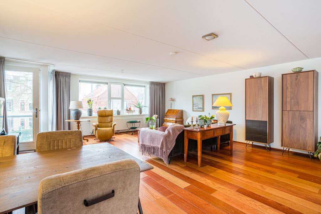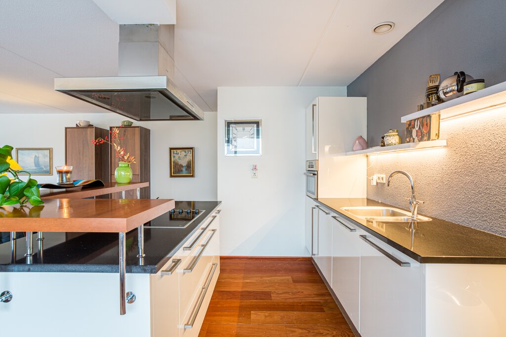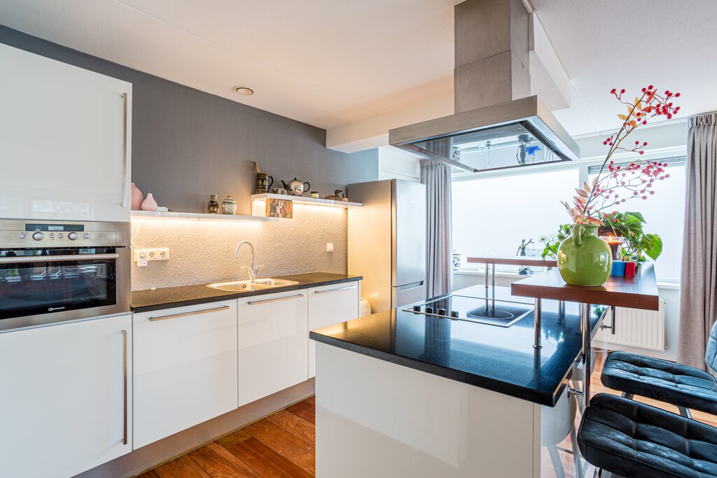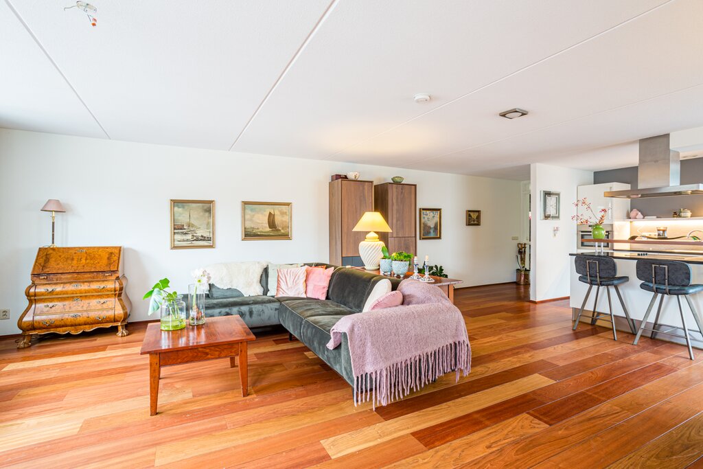 De royale woonkamer (ca. 60m2) gaat over in de luxe open keuken. Deze is voorzien van een kookeiland, eet bar en ingebouwde vaatwasser en combi-magnetron.