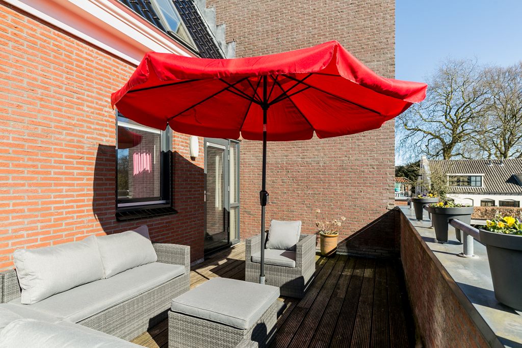 De gehele zuidzijde van het appartement kent een zonnig dakterras van 20m2 met uitzicht over Beetsterzwaag. Bij het appartement behoort op de begane grond een aparte garage/bergruimte met een op afstand te bedienen deur. Er is ruimte voor één auto. Tevens is op de met slagboom afsluitbare parkeerruimte plaats voor totaal twee auto’s.