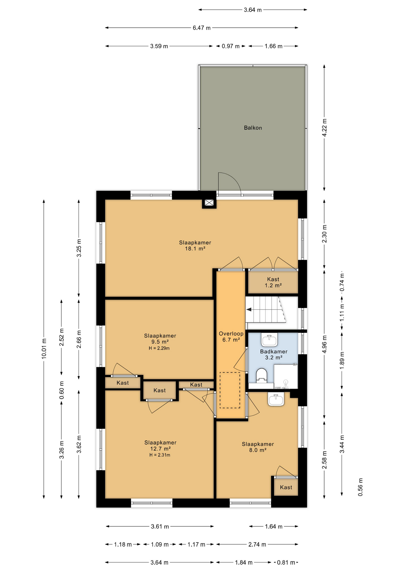 Terug in de woning leidt de trap naar de eerste etage. Daar zijn vier royale slaapkamers, allen voorzien van een of meer vaste kasten. De badkamer is praktisch met douche, toilet en wastafel.