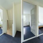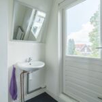 Overloop, drie slaapkamers waarvan één over een wastafel beschikt en middels een deur toegang tot het platte dak heeft.