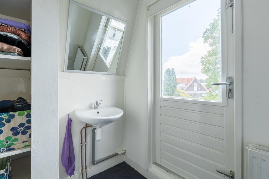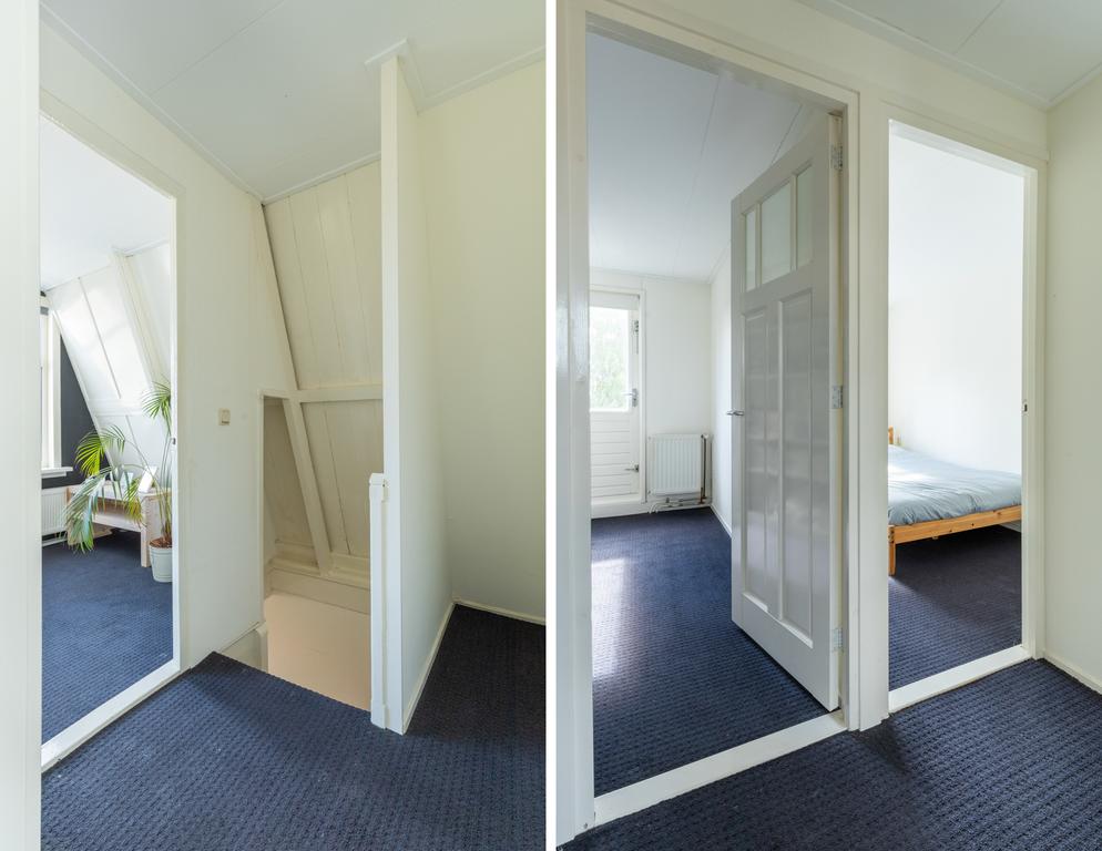 Overloop, drie slaapkamers waarvan één over een wastafel beschikt en middels een deur toegang tot het platte dak heeft.