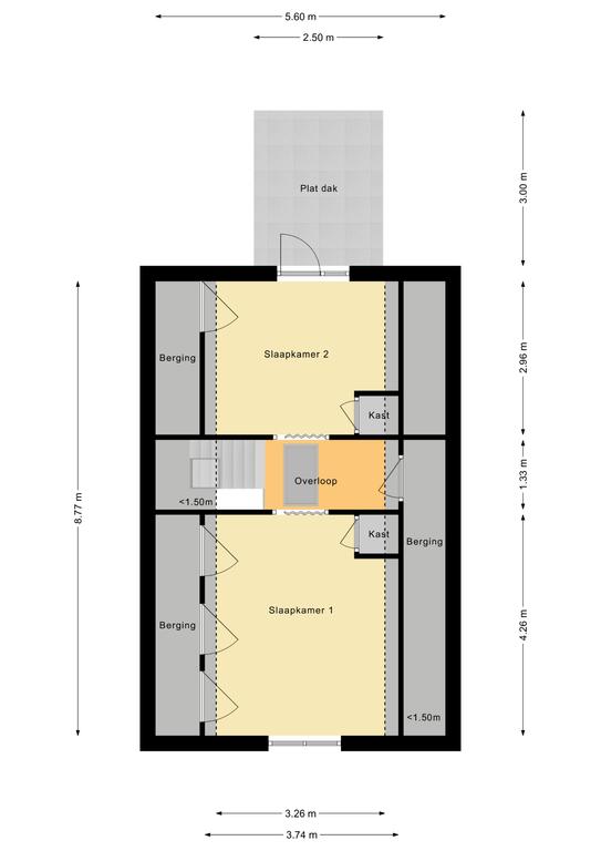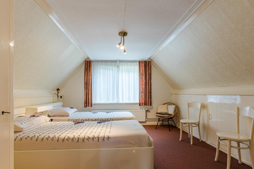 Vaste trap naar de overloop, twee slaapkamers waarvan één toegang heeft tot het platdak aan de achterzijde.
