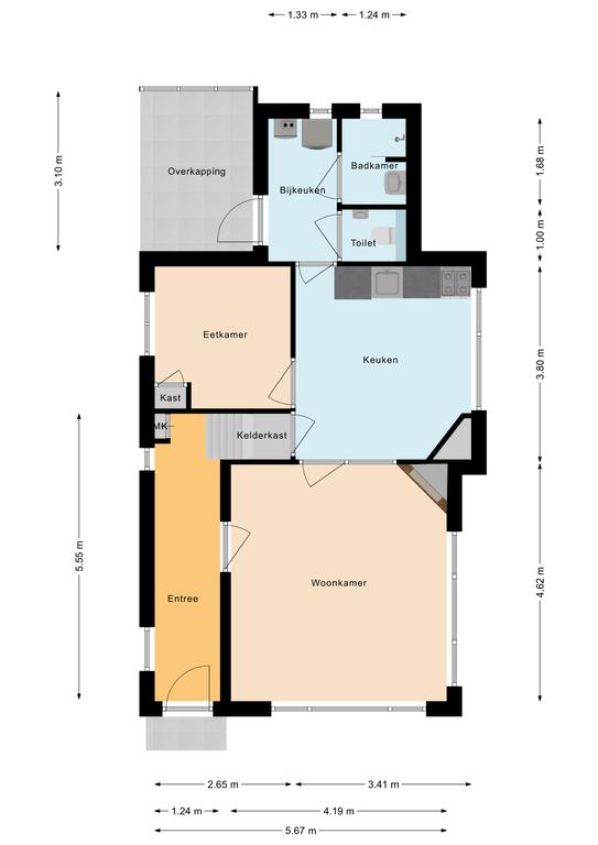 Bij de voordeur aangekomen, bevindt zich de entree, hal, woonkamer met glas in lood deur naar woonkeuken met inbouwapparatuur. Naast de keuken is er een werkkamer/slaapkamer, een bijkeuken met toegang tot de achtertuin, een toilet en een badkamer met douche en wastafel. Naast de woning is de garage met bergzolder, waar plaats is voor één auto en enkele fietsen. Ook is er een hobbyruimte met bergzolder.
