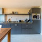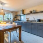 Royaal entree met opstelling van de meterkast en de CV ketel. De hal geeft toegang tot de garage en de woonkeuken. De stoere woonkeuken bestaat uit een recht keukenblok met houten fronten en een betonnen werkblad en is voorzien van een 5 pits kookplaat met afzuigkap, vaatwasser, koelkast en een combi-oven.