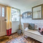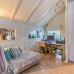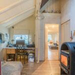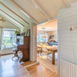 Via een tussenhalletje loopt u vervolgens door naar de badkamer. De badkamer is voorzien van een douche cabine, toilet, wastafelmeubel en elektrische vloerverwarming. Vervolgens komt u in de zeer ruime slaapkamer. Ooit was dit de woonkamer en daarvoor was het zelfs de stal, en dat is nog goed te zien aan de rondhouten gebintstijl in deze kamer met fraai hoog plafond.