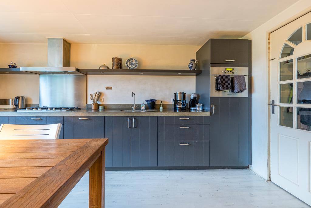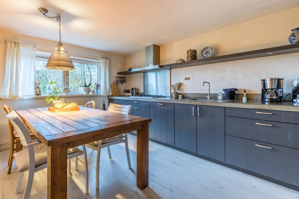 Royaal entree met opstelling van de meterkast en de CV ketel. De hal geeft toegang tot de garage en de woonkeuken. De stoere woonkeuken bestaat uit een recht keukenblok met houten fronten en een betonnen werkblad en is voorzien van een 5 pits kookplaat met afzuigkap, vaatwasser, koelkast en een combi-oven.