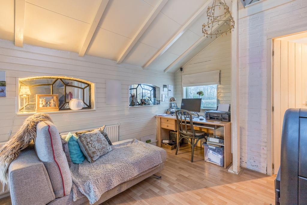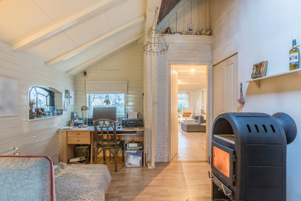 Via deze woonkeuken komt u via een opstapje in de voorkamer welke wordt gebruikt als muziek- en studeerkamer. U loopt verder naar de zeer ruime woonkamer welke gelegen is aan de voorzijde van de woning. De woonkamer heeft aan 3 zijden ramen en daardoor een prachtig uitzicht over de natuur.