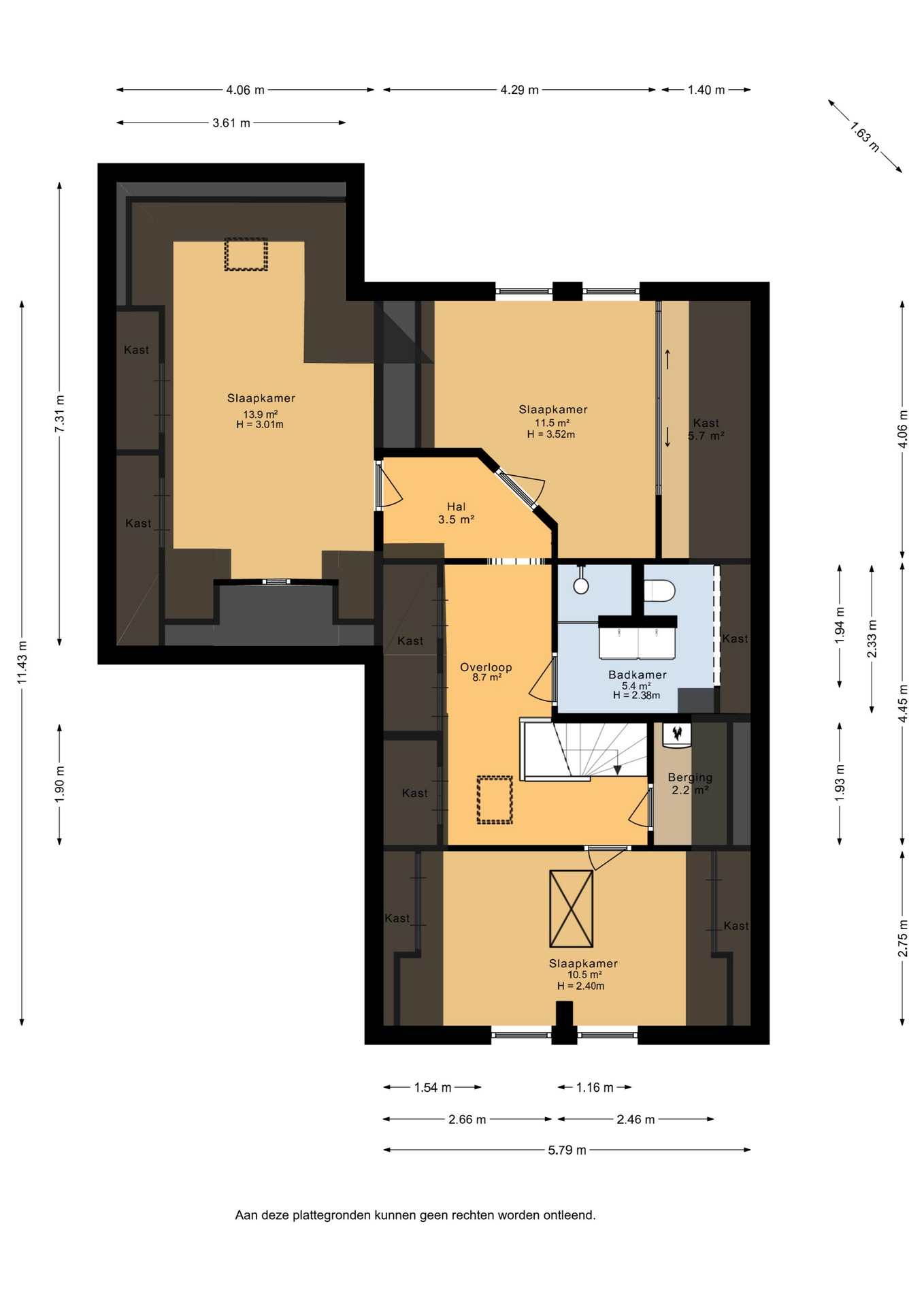 Via de trap kom je op een opvallend ruime overloop. Zowel hier als in alle slaapkamers is slim gebruik gemaakt van de schuine kanten van het dak. Overal is bergruimte of zijn vaste kasten aanwezig.
