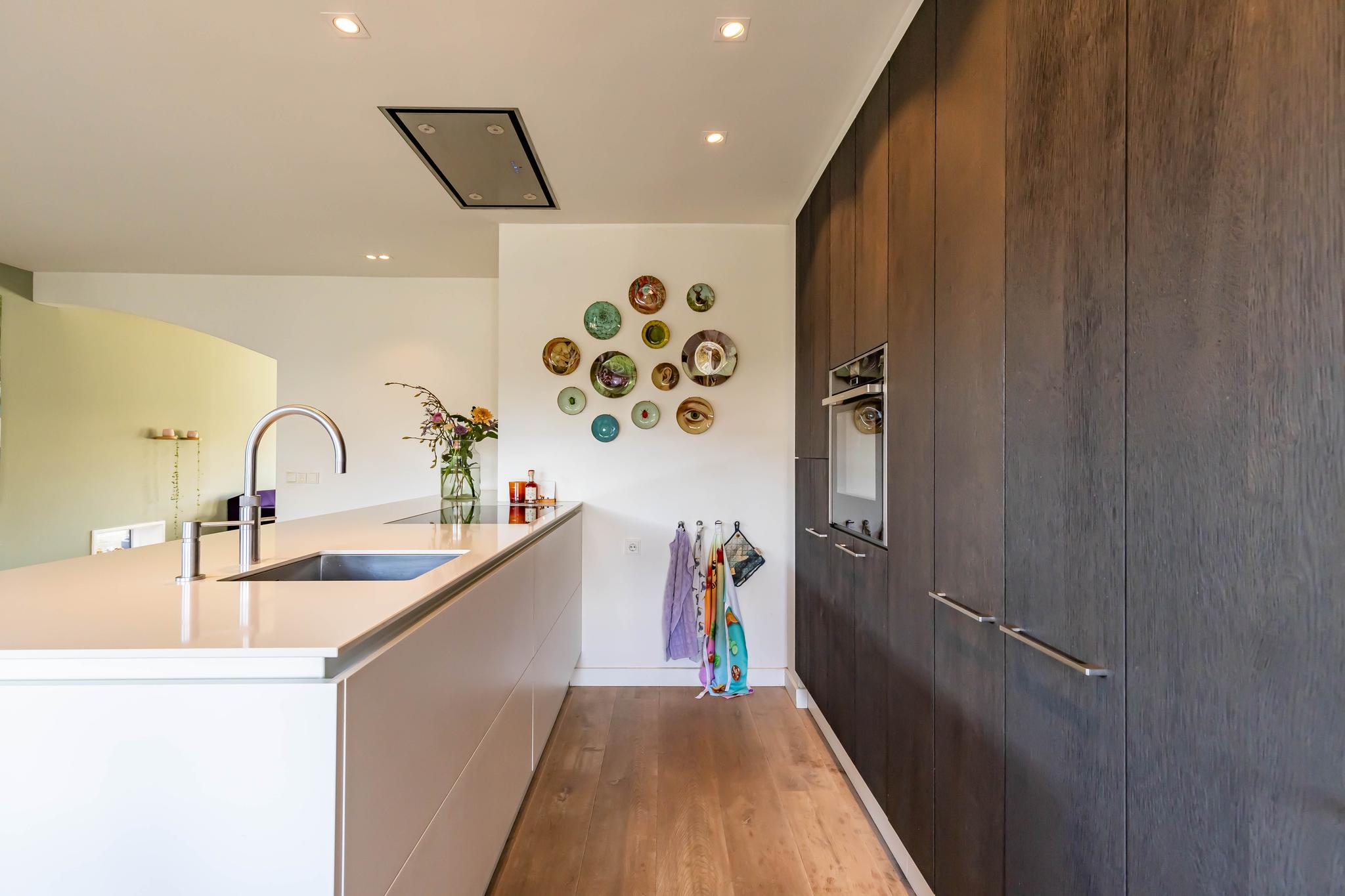 De entree met een modern toilet, een garderobe en een meterkast. Aan de voorzijde van de woning ligt de gezellige woonkamer met een fraaie houten vloer. Deze vloer loopt door in de uitbouw, waar de zeer ruime woonkeuken is gelegen. De keuken is van alle gemakken voorzien: een gloednieuwe kookplaat met in het plafond een weggewerkte afzuigkap, een XL-koelkast, een aparte vriezer, een stoomoven, een vaatwasser op hoogte en veel kastruimte.