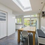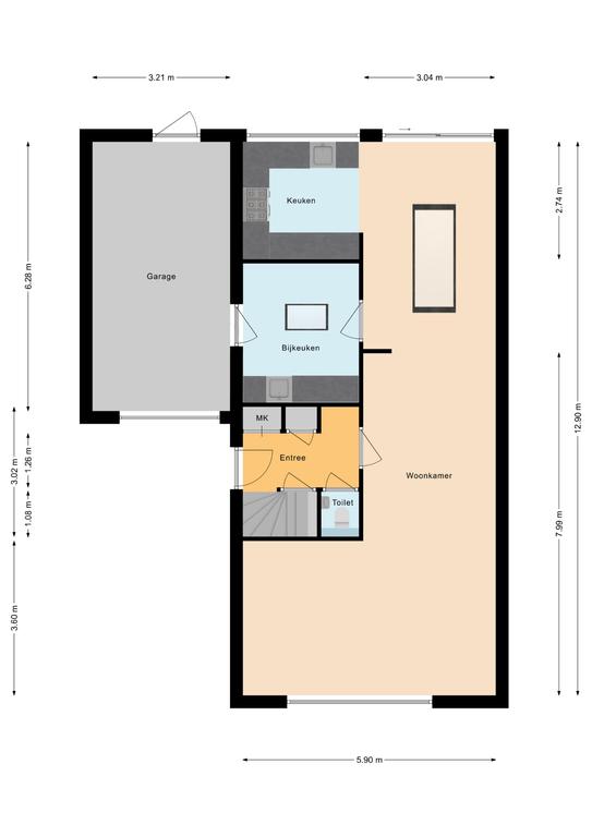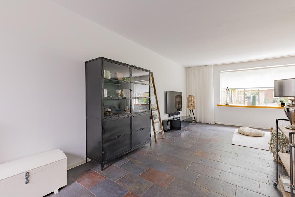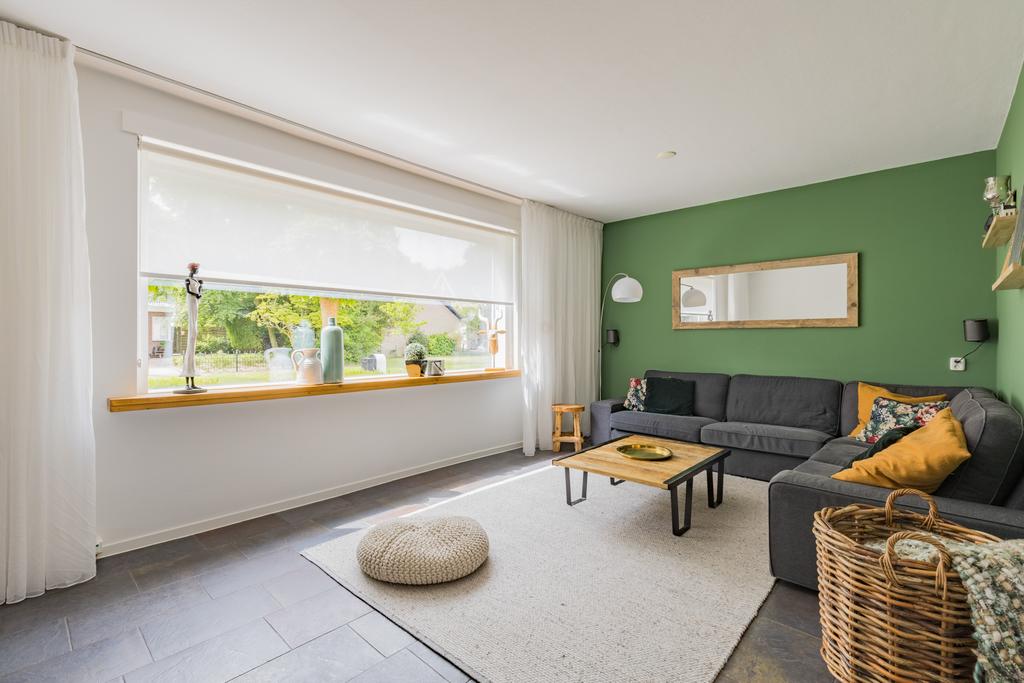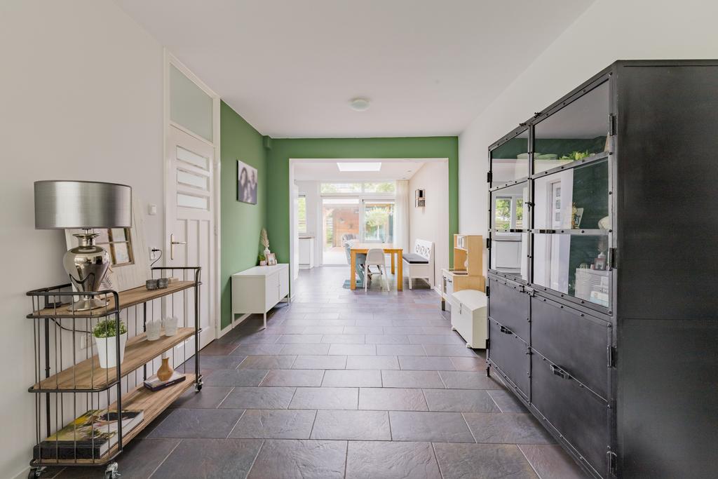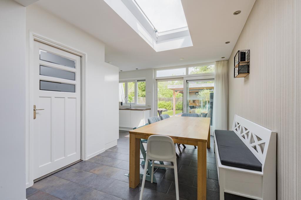 Via de voordeur komt u binnen in de hal, waar het toilet, de meterkast en de twee bergkasten zich bevinden. De L-vormige woonkamer biedt uitzicht op de straatkant. In de uitbouw is de halfopen keuken gesitueerd met een eethoek die uitzicht geeft op de heerlijke ruime tuin. Uiteraard is de keuken van alle gemakken voorzien en biedt de schuifpui directe toegang tot de tuin met een veranda die af te sluiten is met glazen panelen. Daarnaast is er nog een ruime bijkeuken aanwezig, welke gebruikt kan worden als washok en voorzien is van inbouwkasten. Via de bijkeuken loopt u direct door naar de garage met gietvloer.