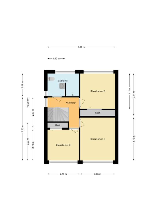 Op de eerste verdieping vindt u de overloop met drie slaapkamers en een badkamer. De twee slaapkamers zijn voorzien van inbouwkasten en de badkamer heeft een inloopdouche, een royale wastafel en een toilet.
