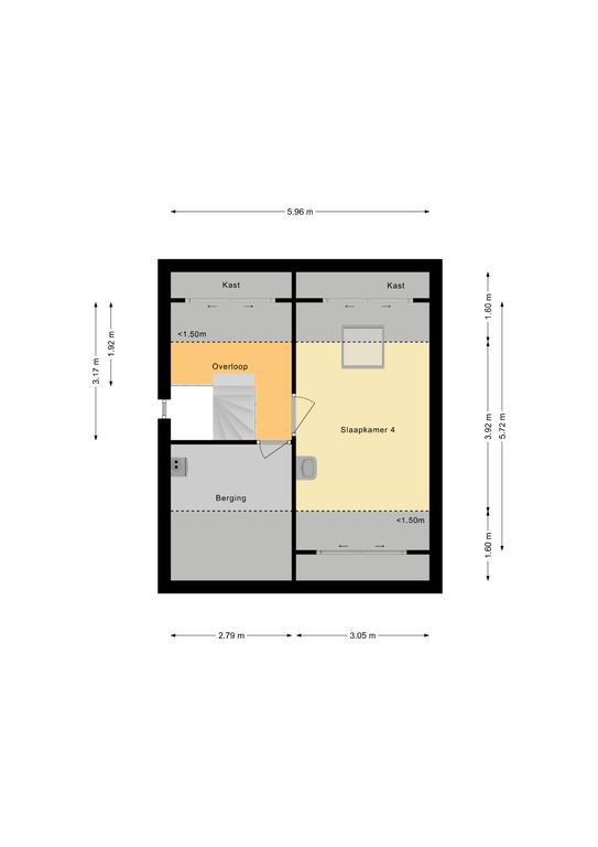 Met een vaste trap gaat u naar de tweede verdieping, waar u via de overloop met bergruimte de grote vierde slaapkamer bereikt.