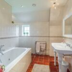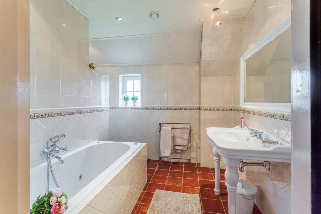 Overloop, tweetal slaapkamers, badkamer met bad, douche en wastafel, via een deur naar vliering werkplaats/ garage.