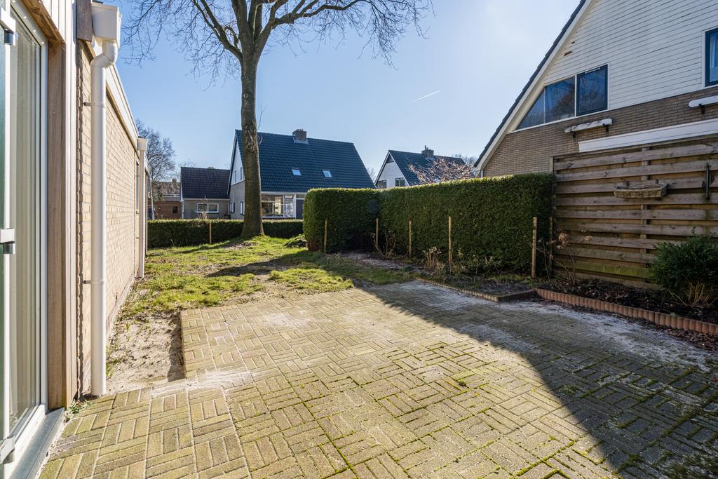 De tuin is op het zuiden gelegen. De tuin is bereikbaar achterom via de bijkeuken en via de openslaande deuren vanuit de keuken.